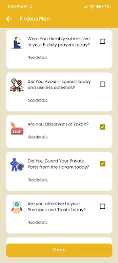 The App provides you with a firdous plan which is one of the best plan to get to our ultimate destination. The App allows you to track your progress throughout the whole month. It has a graph which lets you see how many deeds you completed on which days.