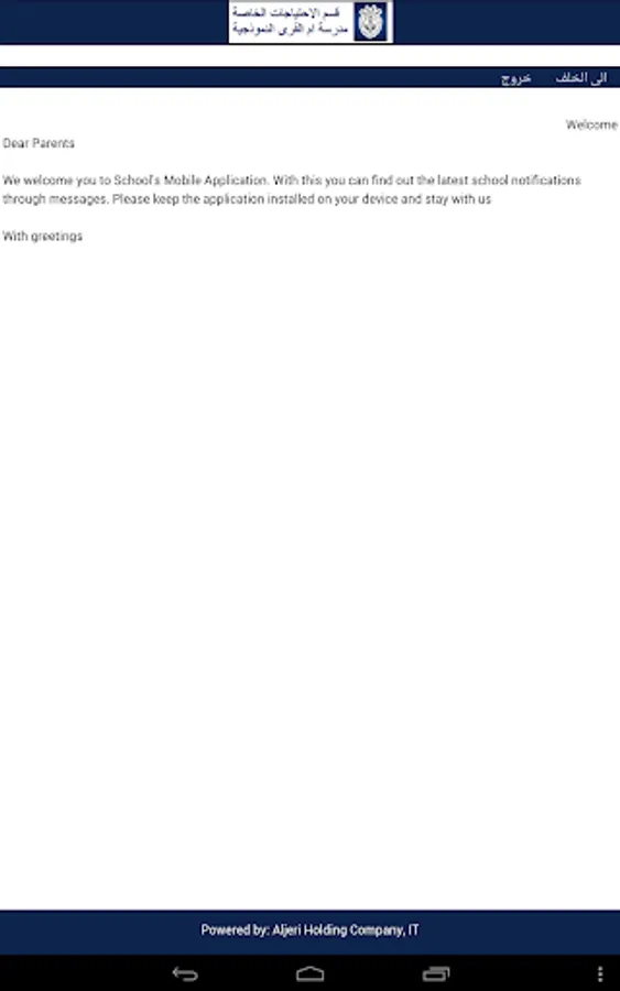 من خلال هذا التطبيق سيتم إرسال رسائل تخص ابنائنا الطلبة من قبل إدارة المدرسة لأولياء الأمور وهذا التطبيق بدلا عن الرسائل القصيرة.
