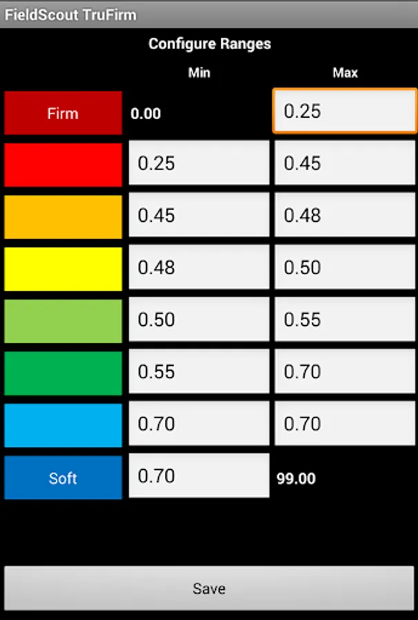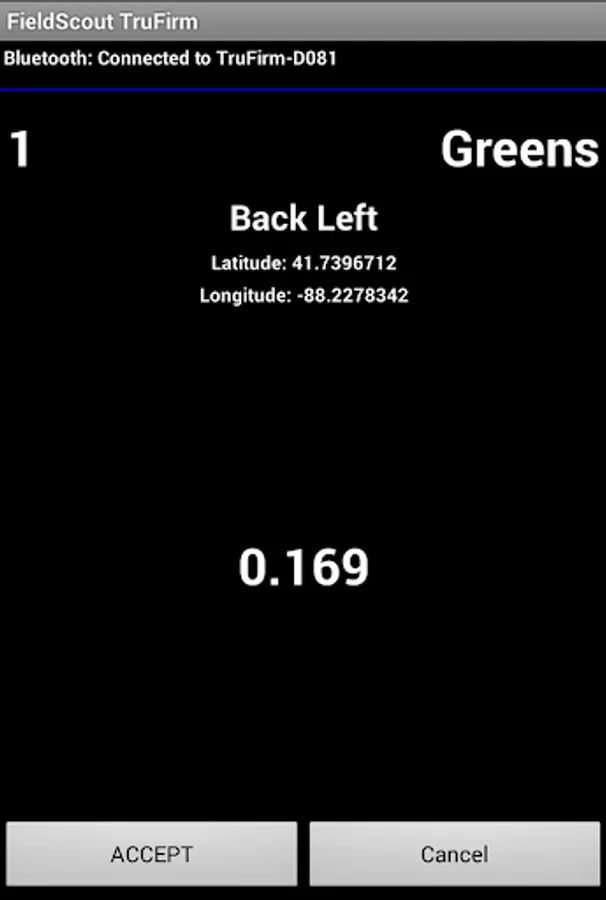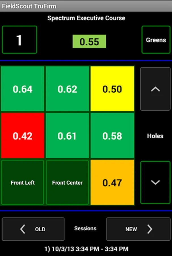 The FieldScout TruFirm Android app allows users to record turf and bunker sand firmness measurements from their FieldScout TruFirm meter and analyze the data over nine distinct regions for each given sample area. Users can save and compare information for multiple courses, measurement sessions, course holes, and surface types.