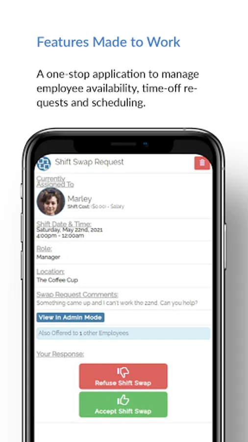 • Streamline communication with automatic notification options for new schedules, time off requests, shift swapping, shift reminders, and more