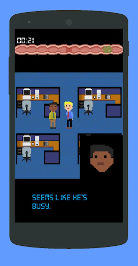 Today is Bob's first day in the office, and things aren't looking good. You have 25 seconds to get Bob to the bathroom or else his co-workers will never look at him the same.