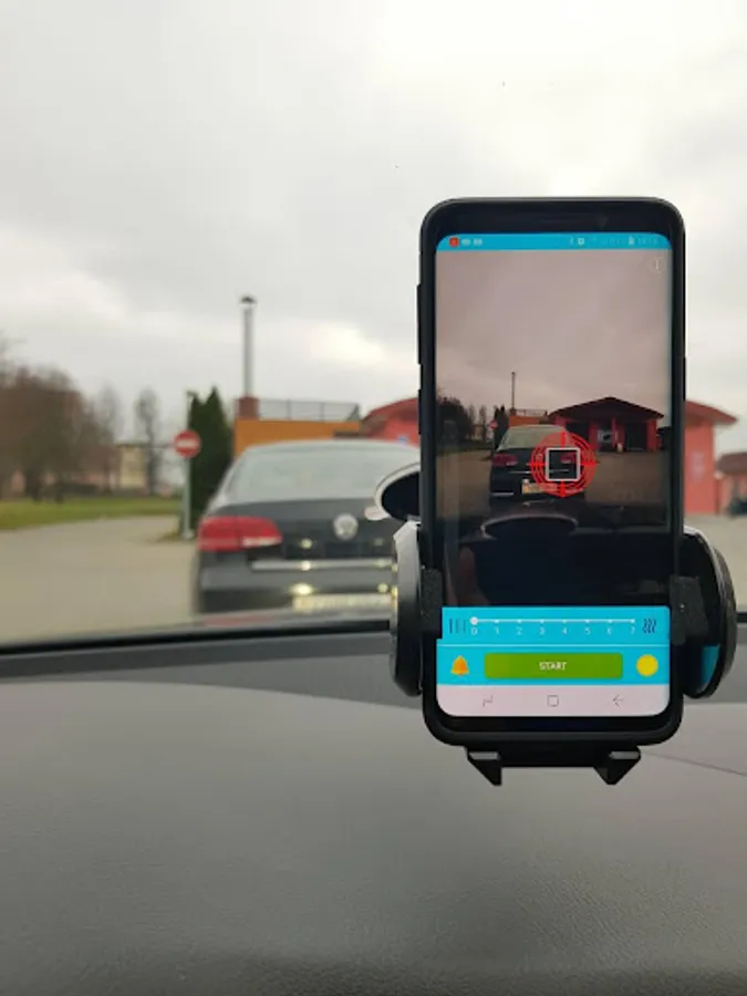 As soon as the machine that stands in front of you starts moving, the application will start beeping.