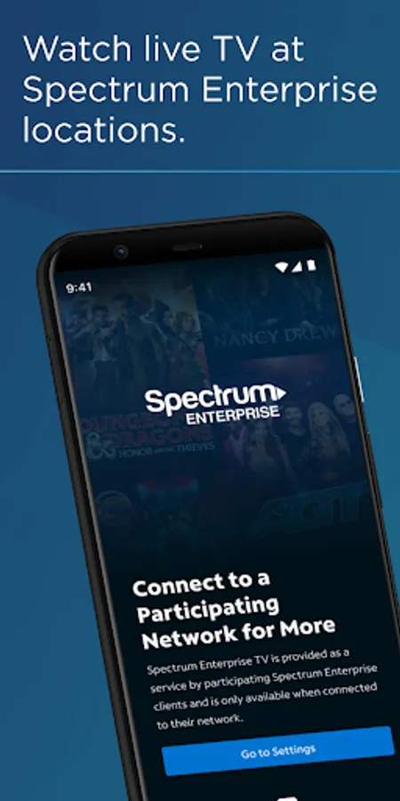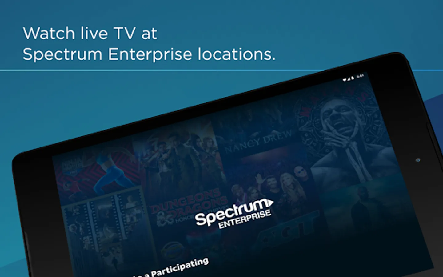 Download the Spectrum Enterprise TV app and enjoy Spectrum TV at participating Spectrum Enterprise locations. The Spectrum Enterprise TV app lets you stream live TV and thousands of On Demand shows and movies.