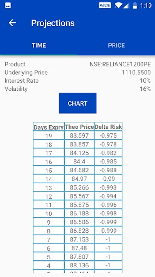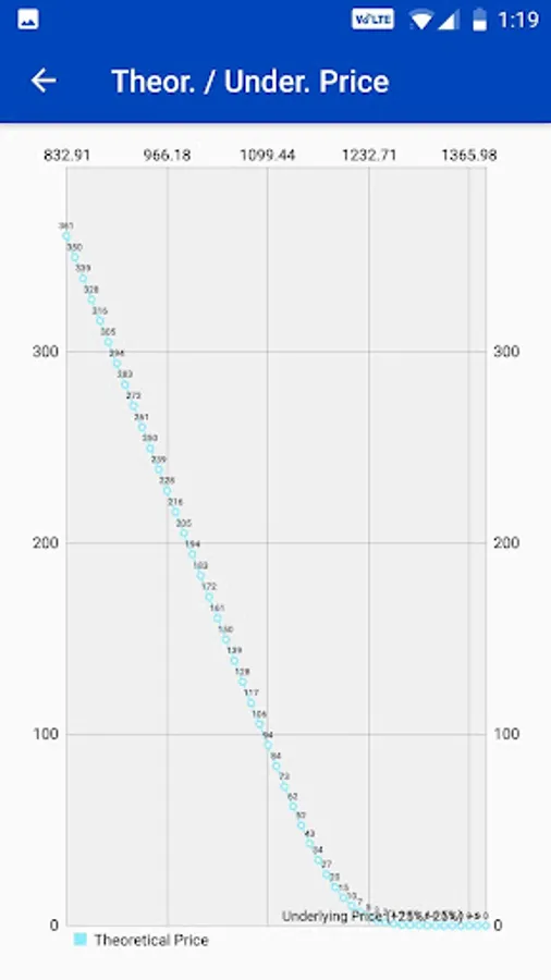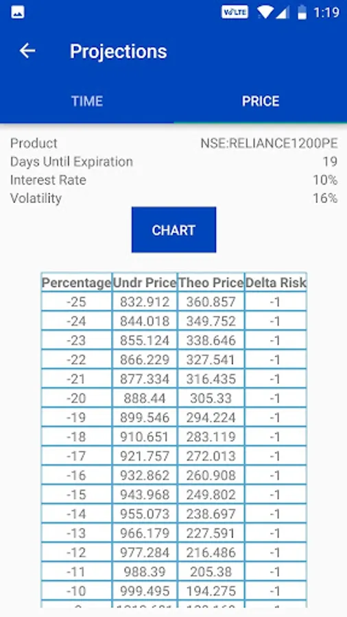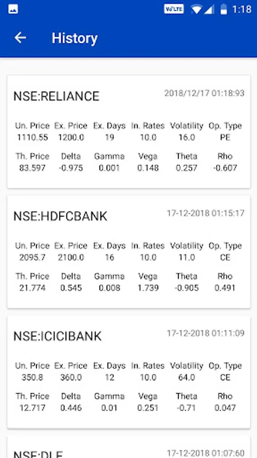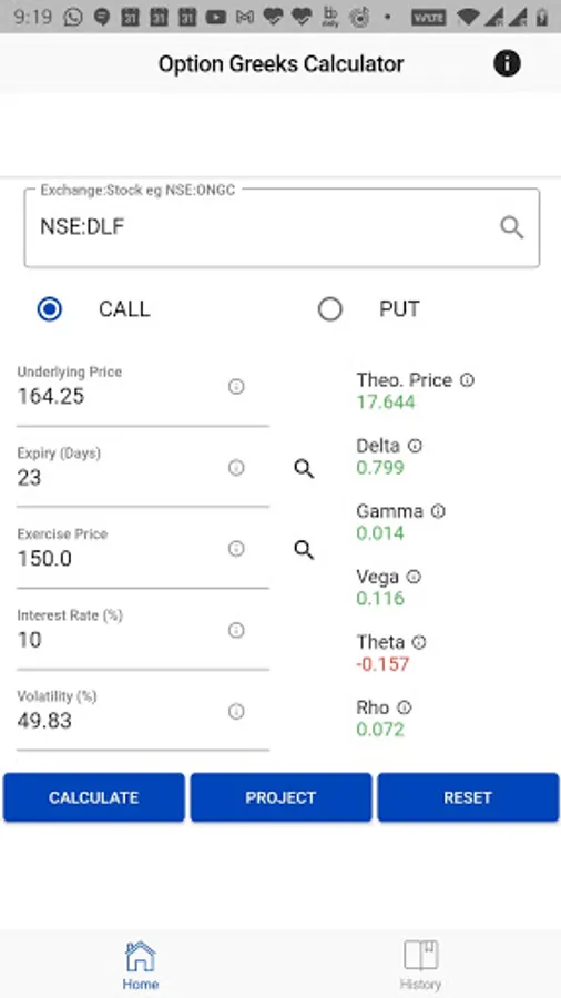 The app calculates theoretical price and option greeks using black-scholes model with the most accurate calculations around d1, d2, call and put prices with 16 decimal accuracy using cumulative distribution and standard normal distribution. For display purpose, we later round these values to 3 decimal places.