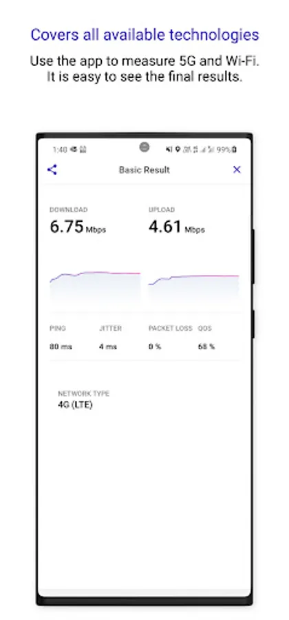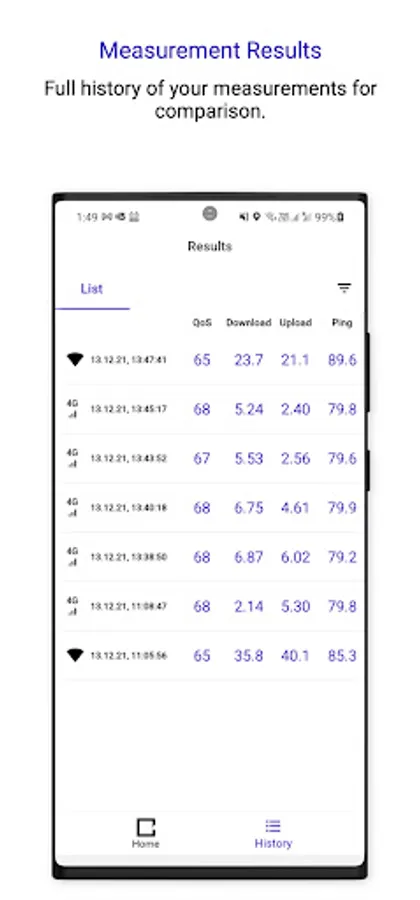 - a map view of all test results with filter options for test parameters, statistics, operator, device and time of day