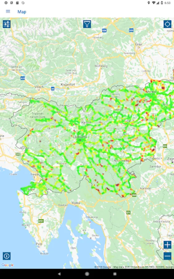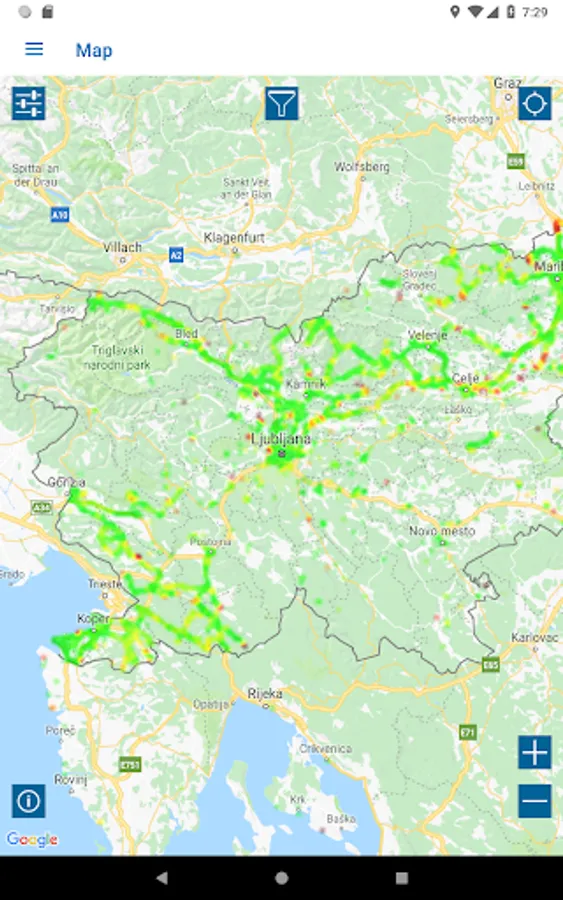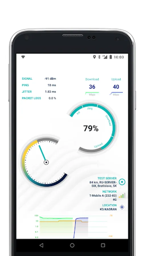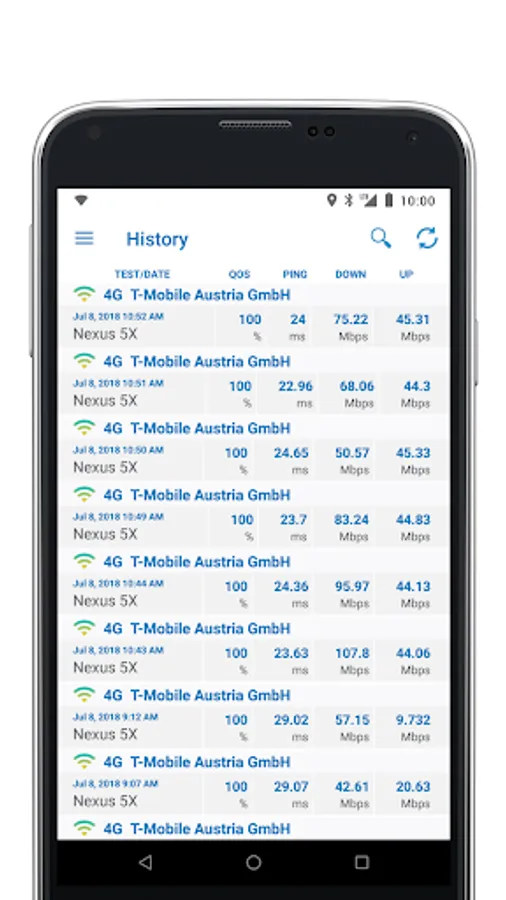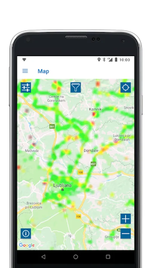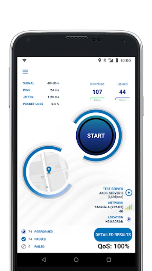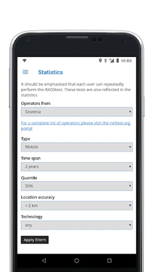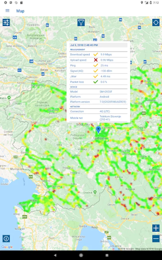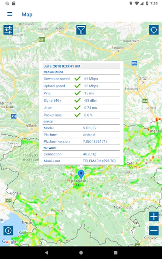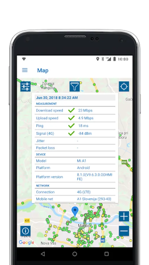 - a map view of all test results with filter options for test parameters, statistics, operator, device and time of day
