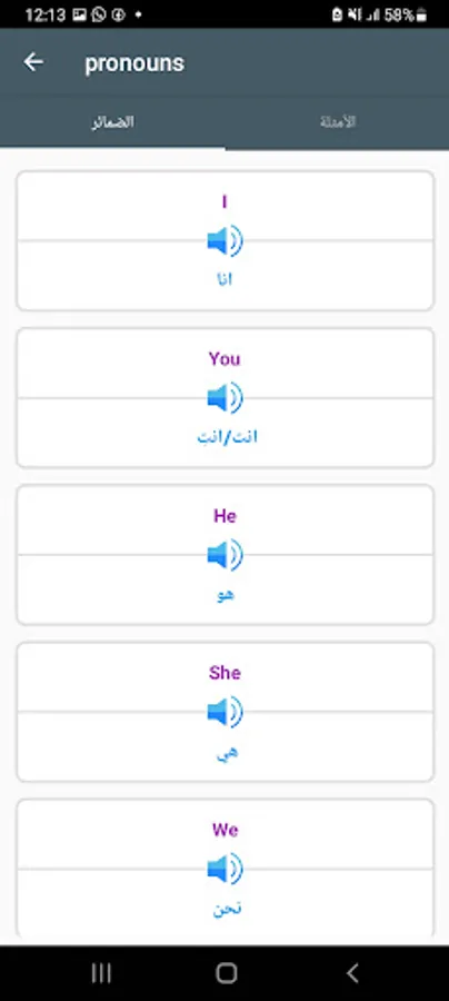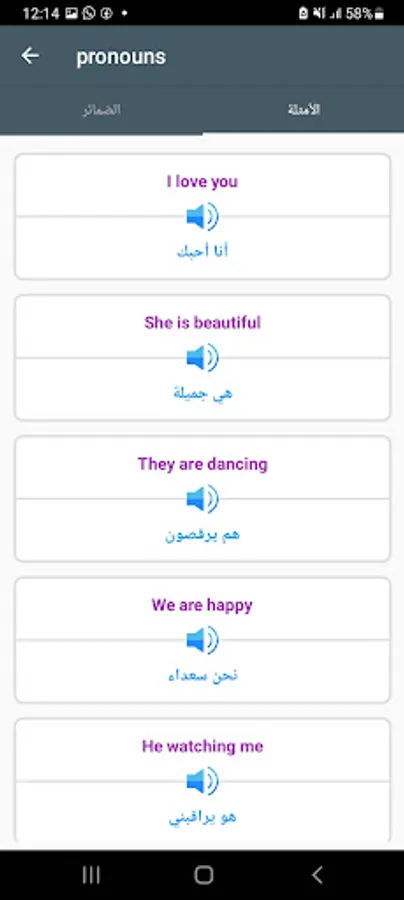 وهناك خاصية الصوت تسمح لك بالضغط على اي كلمة او عبارة وتسمع كيف تنطق لتعلم الانجليزية بالصوت