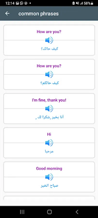 * اضافة الصوت لتعلم كيفية نطق الكلمات و العبارات , فما عليك الا ان تضغط على الكلمة او العبارة التي تريد ان تسمع كيف تنطق وسينطقها التطبيق