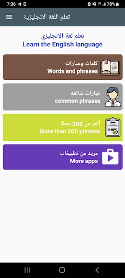 تعلم اللغة الانجليزية بالصوت كلمات وعبارات و تطبيق يسمح لك بتعلم اللغة الانجليزية بسهولة و اتقان اللغة الانجليزية باسهل طريقة، فهو يحتوي على امثلة تساعدك على فهم اللغة الانجليزية و ايضا يحتوي على اكثر من 25 صنف وكل قسم يحتوي على الكثيير من الكلمات و الامثلة للفهم بسهولة.