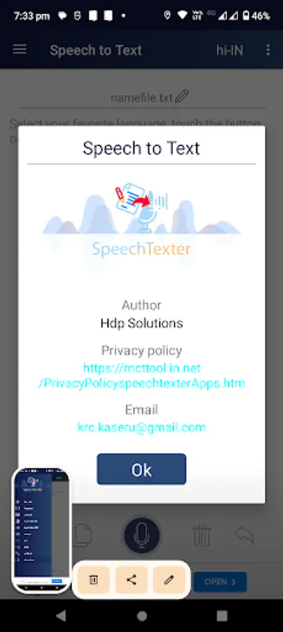 The app ensures privacy by not storing any dictated text on its servers. Instead, all speech processing occurs on Google's servers, with the privacy policy available at https://mctool.in.net/PrivacyPolicyspeechtexterApp.htm.