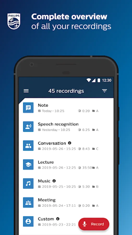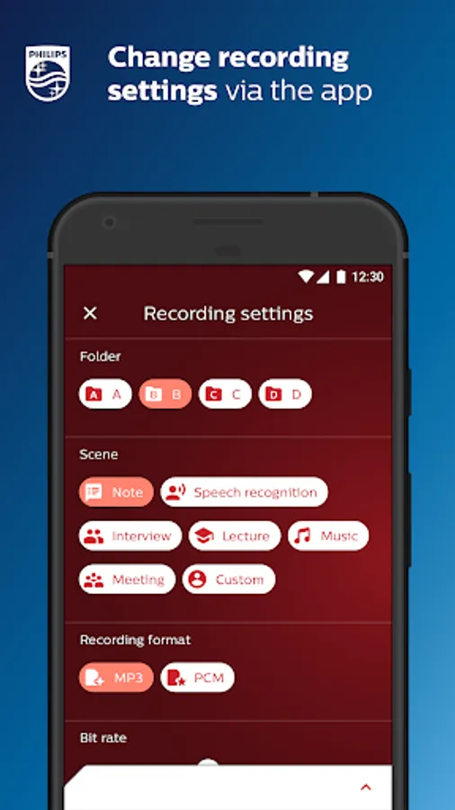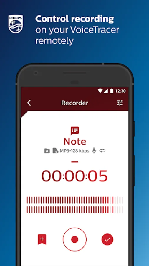 Control your Philips VoiceTracer Audio Recorder using your smartphone, even from a distance. The app makes recording lectures, meetings or music much easier and more convenient. You can place your recorder in the front of the room near the speaker, take a seat at the back, and still control and adjust the recording comfortably and without interrupting others. You can remotely pause and restart the recording whenever needed and mark any important positions by setting bookmarks.