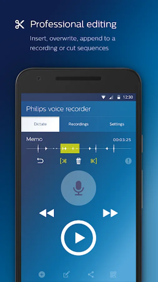 The Philips voice recorder app offers first-class recording quality, professional functions such as inserting or cutting sequences, and an intuitive operation. Recordings can be easily sent via email, Dropbox, Google Drive, etc. For maximum security, browser-based file management and additional services such as speech recognition, we recommend the use of our convenient Philips SpeechLive service.