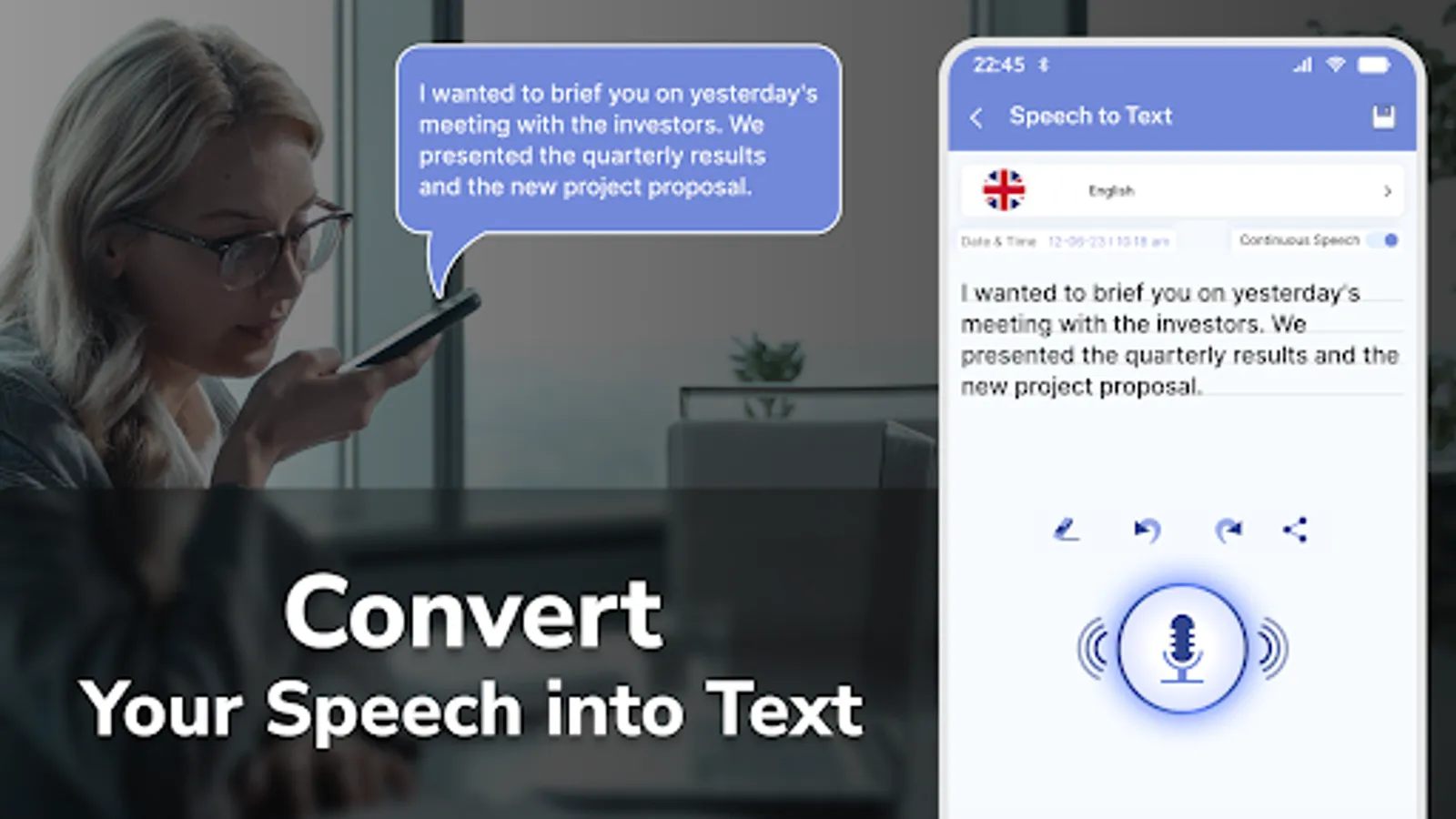 Voice to text converter is simple to use for dictating/recognizing text It is a Voice typing in all languages which can be sent as an SMS or copied and pasted into all other apps existing in your device. The app uses Androids built-in Speech Recognizer/microphone to turn speech into text and Translate in all languages simultaneously