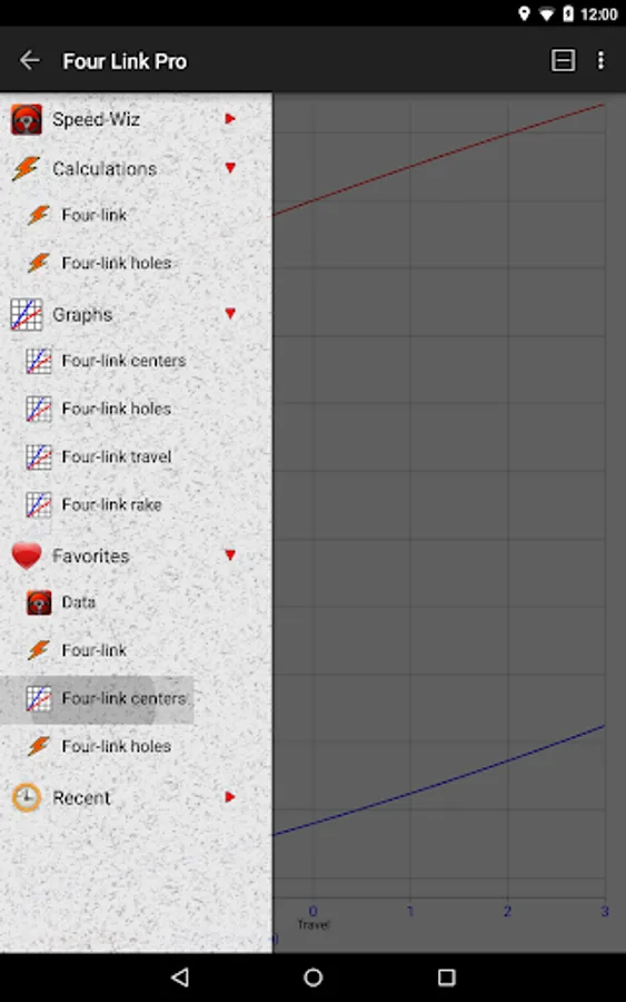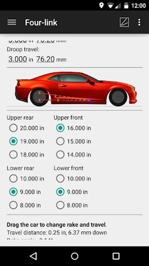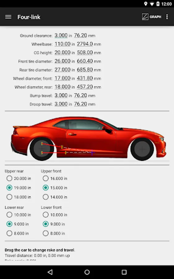 Speed-Wiz Four-Link Pro has all the four-link suspension calculations you need to build and set up four-link suspensions for cars and trucks. It's easy to enter your four-link suspension details. Any number of holes can be specified for each end of each link. Then it's just one touch to switch from one to another and immediately visualize the suspension geometry. The car profile view shows the suspension link positions as the car travels up and down and dives and squats. You simply drag the car around to view your four-link suspension geometry changes.