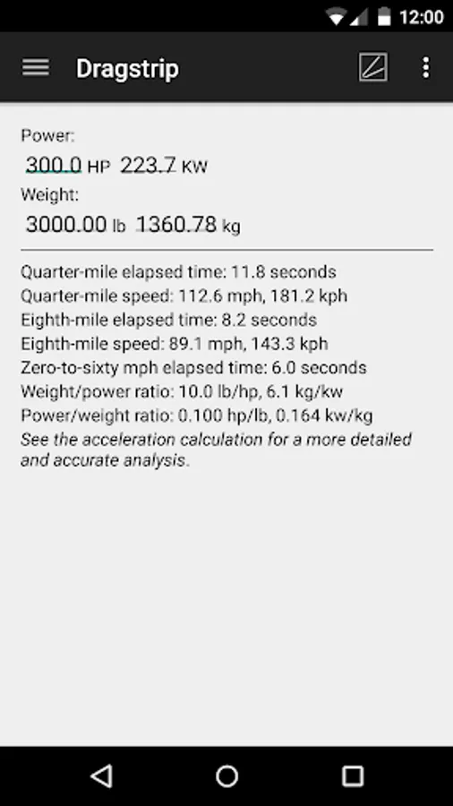 - Dragstrip (simple acceleration calculations for various speeds and distances based on power and weight)