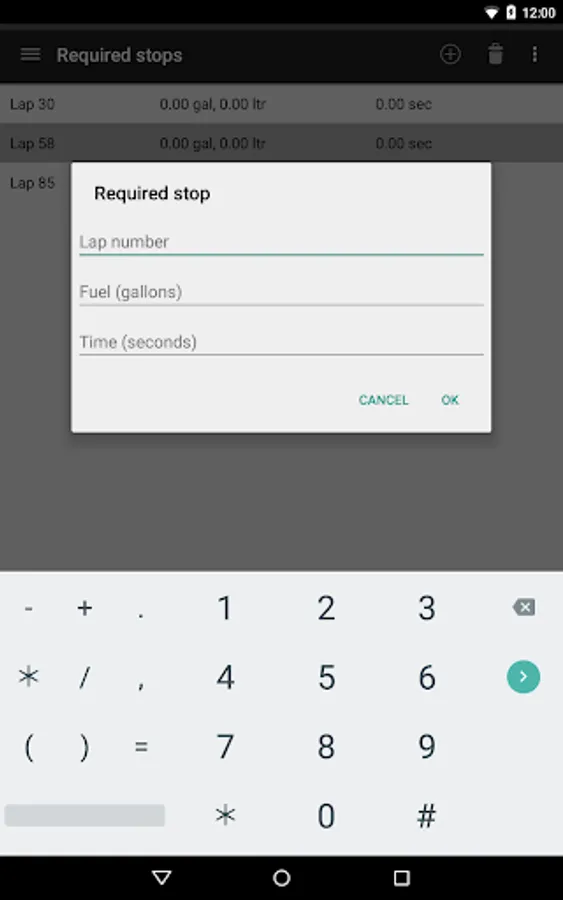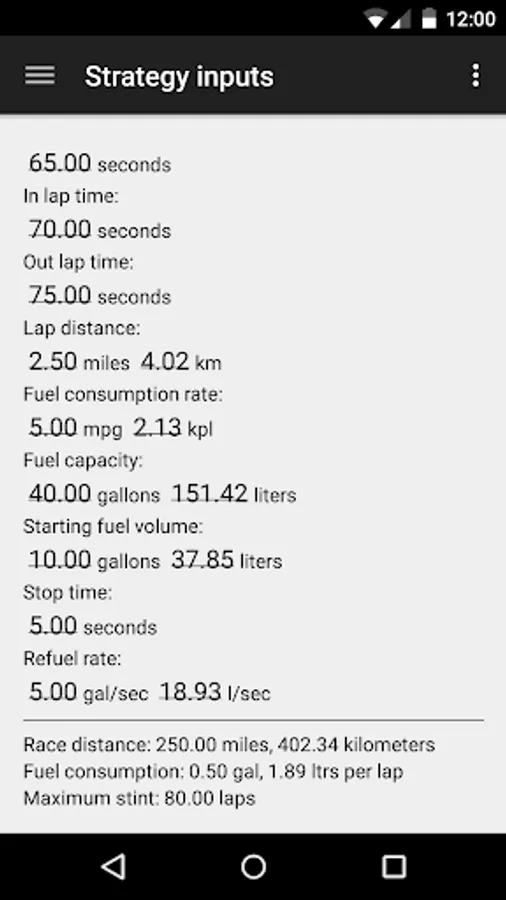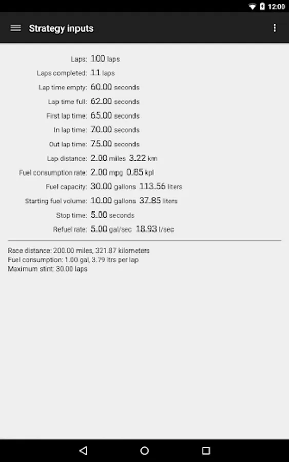 Specify all inputs including race laps, lap time, first lap time, in lap time, out lap time, lap distance, fuel consumption, fuel capacity, starting fuel volume, base pit stop time, refueling rate. All inputs are explained in the online help.