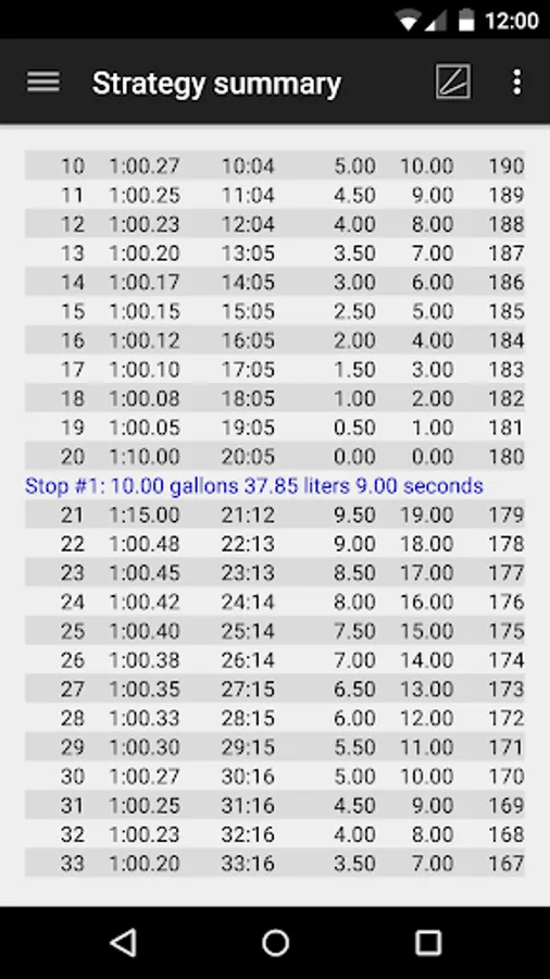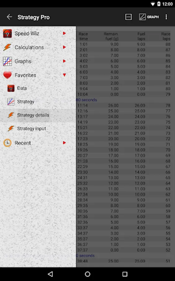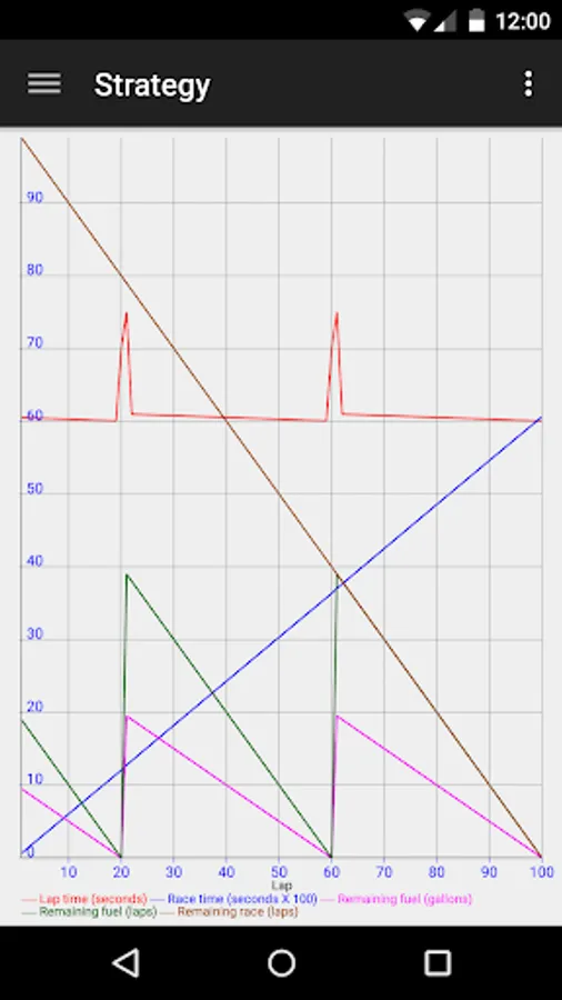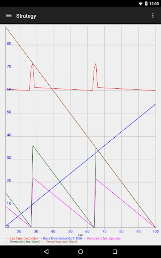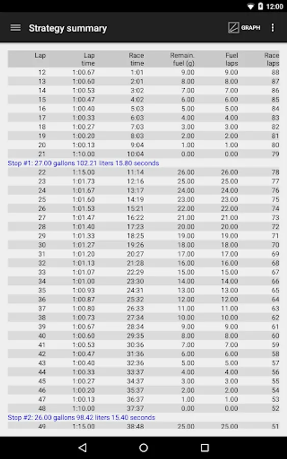 Graphs are included in order to visualize strategy throughout the entire length of a race. Graph elements include lap time, race time, volume of fuel remaining, laps of fuel remaining, and laps remeining in the race.