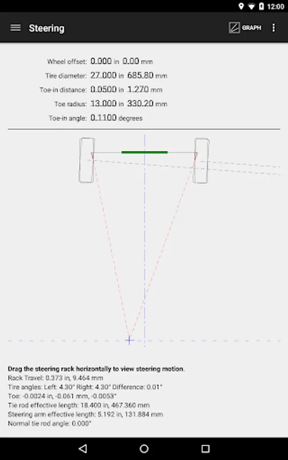 - Steering geometry simulation including Ackermann steering geometry and turning circle