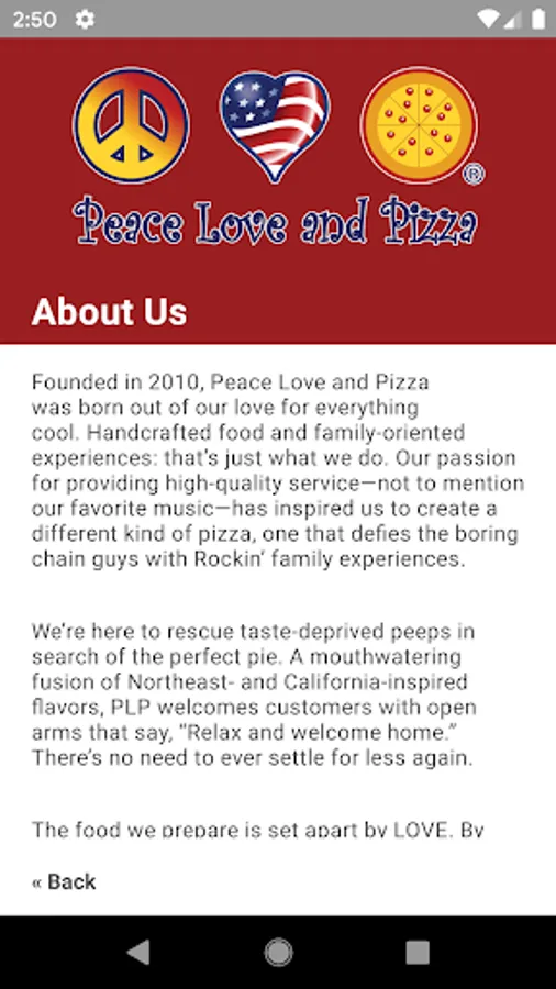 With the Peace Love & Pizza app you can: