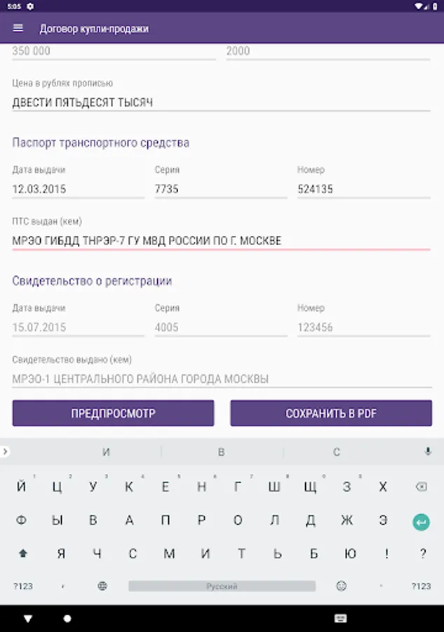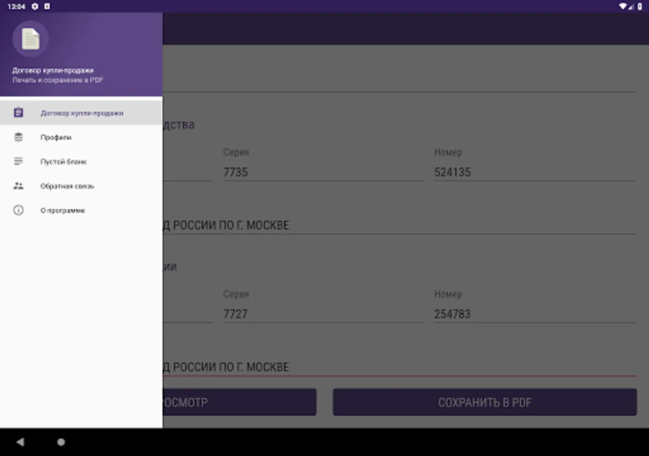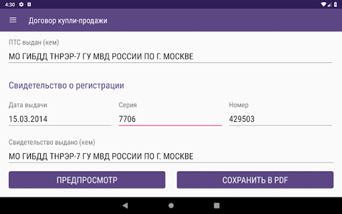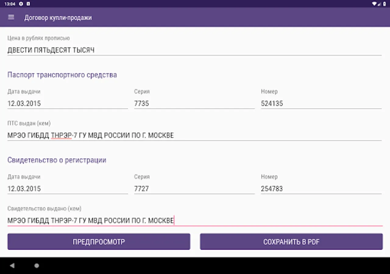 A simple and convenient ad-free application for drawing up a vehicle purchase and sale agreement and PDF export in one go.