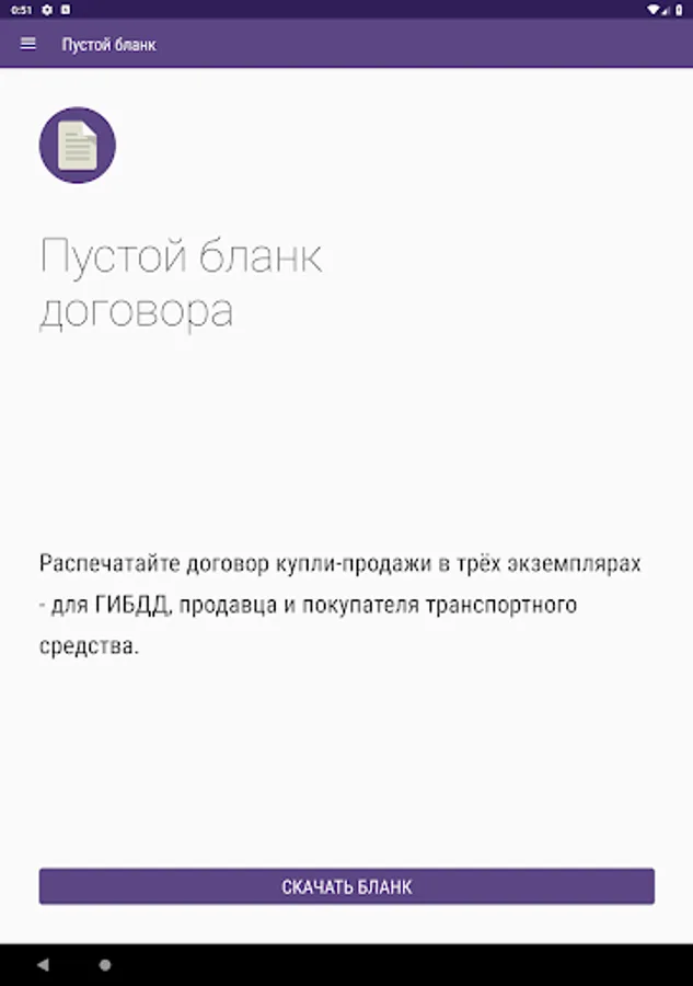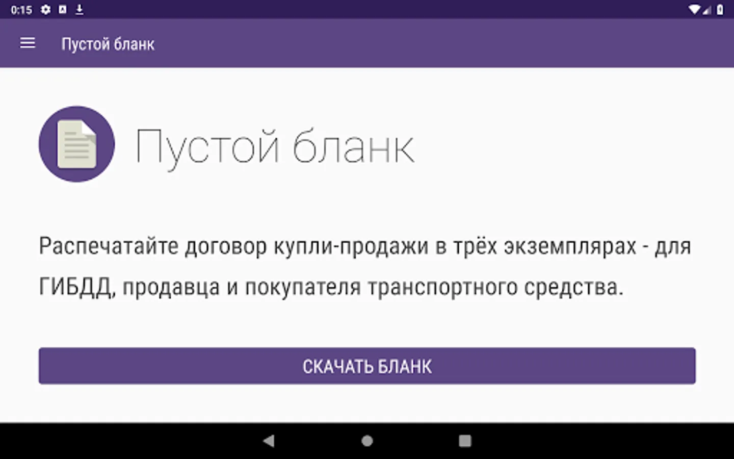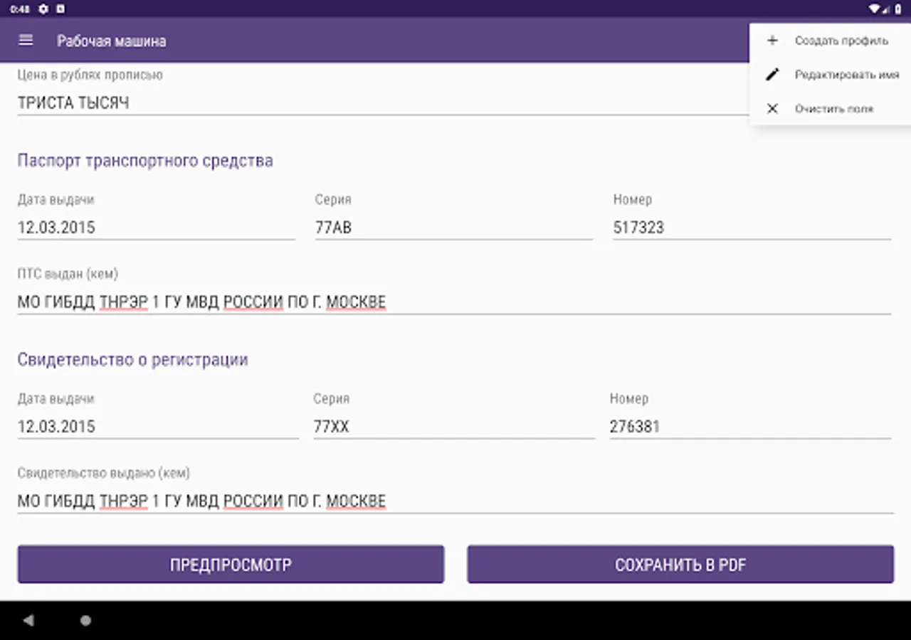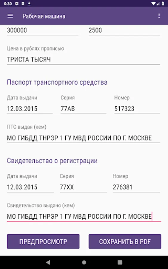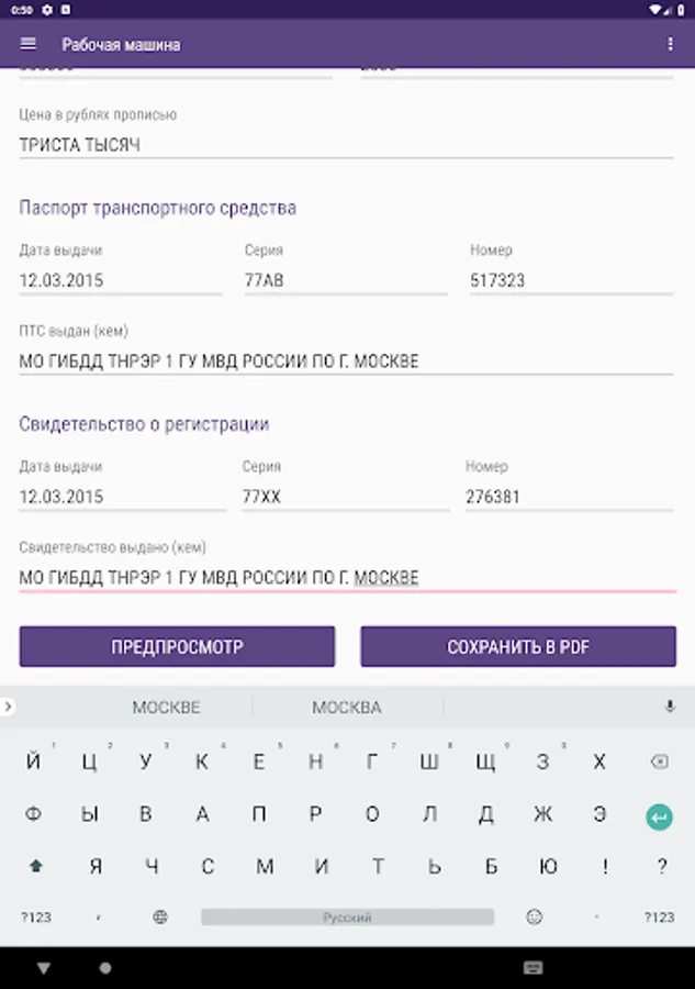 A simple and convenient application for drawing up a contract of sale and an act of acceptance of any vehicle, including with Electronic PTS.