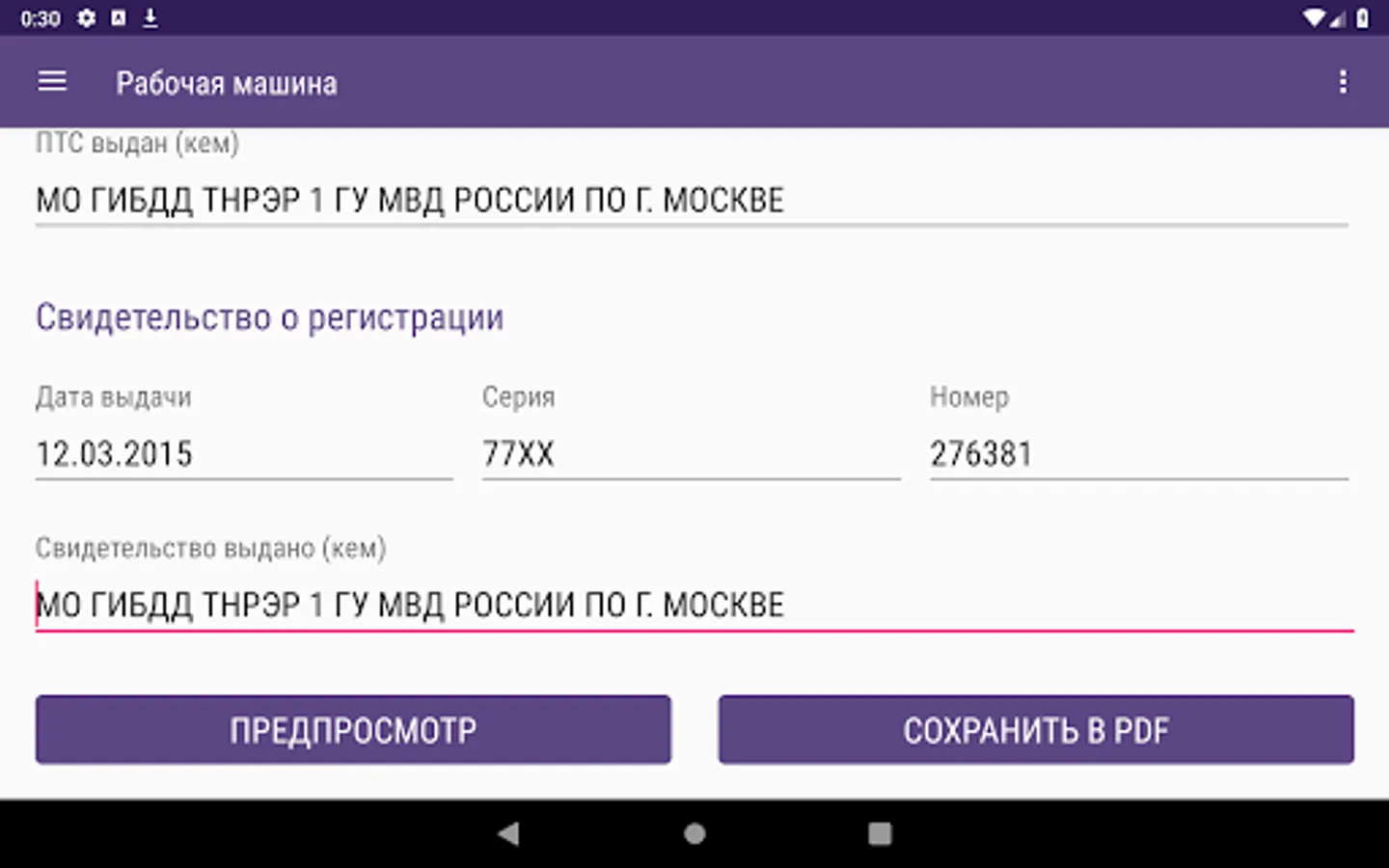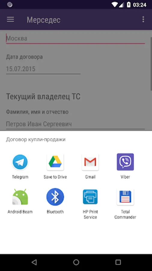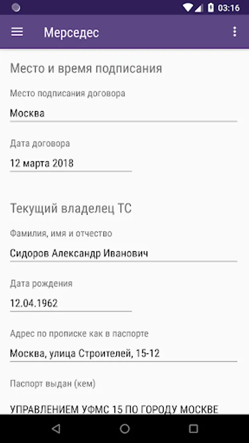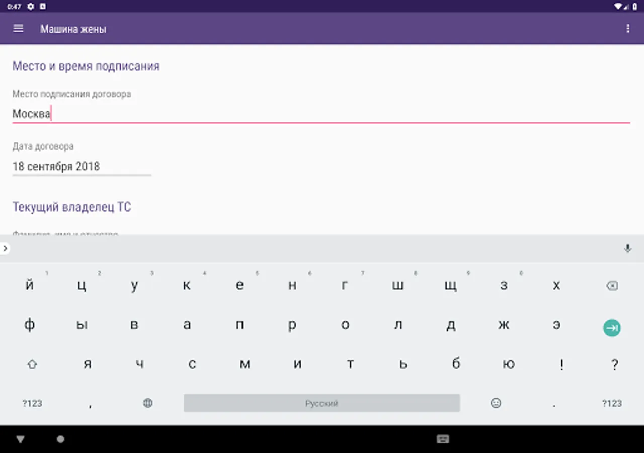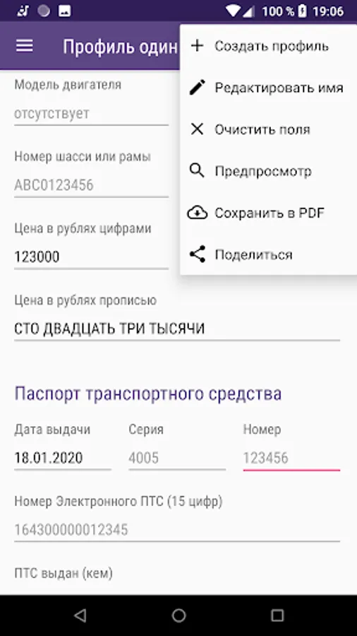 A simple and convenient application for drawing up a contract of sale and an act of acceptance of any vehicle, including with Electronic PTS.