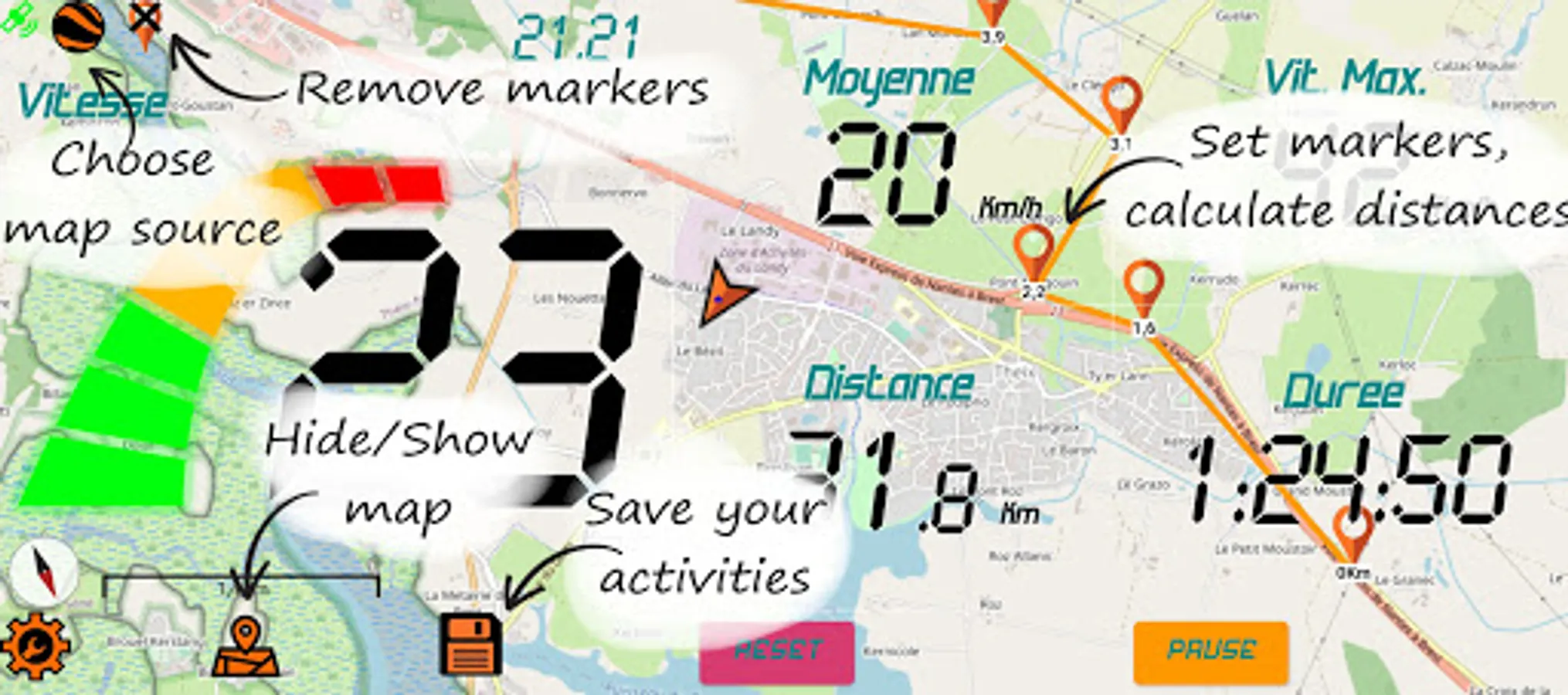 - Map support! Choice of sources, markers (prepare your trip), compass, mesure distances, etc.