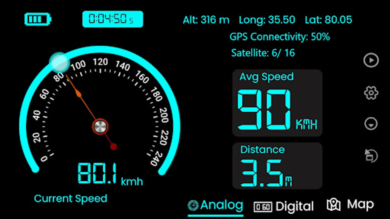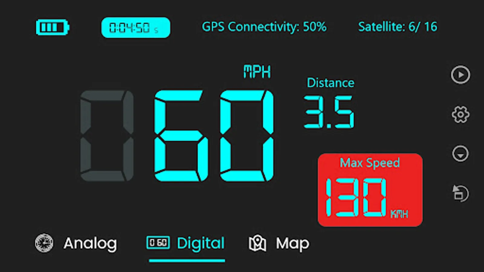 >In digital mode Km/h, Current Time, Start time, Journey Time and Total Distance is displayed.