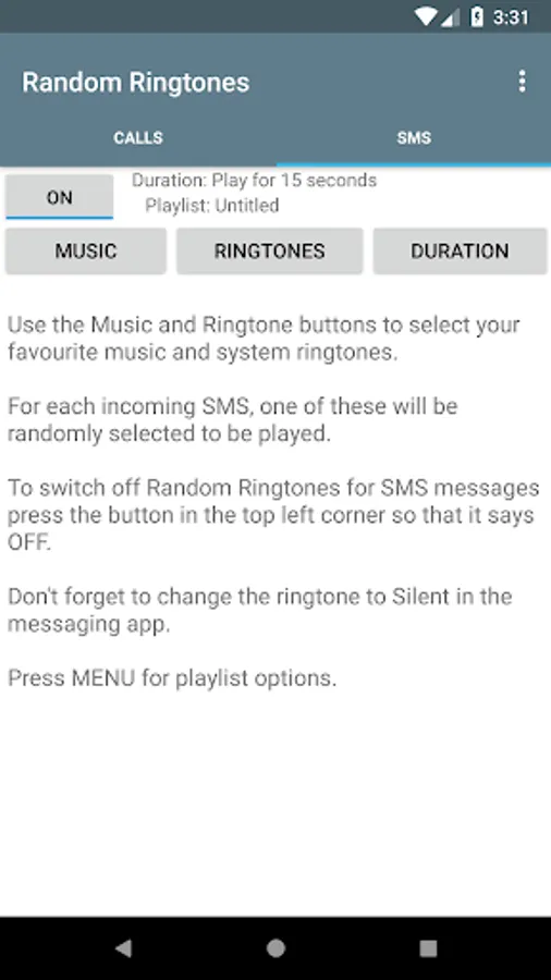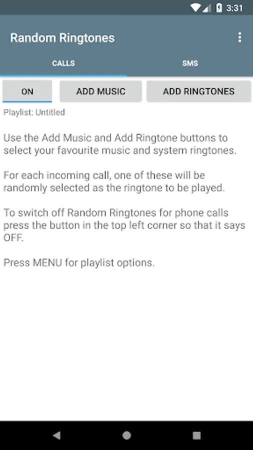 Randomize your ringtones for incoming calls and text messages. Make playlists and assign them to either calls or SMS. When a call or text message arrives a random selection will be made from the assigned playlist.