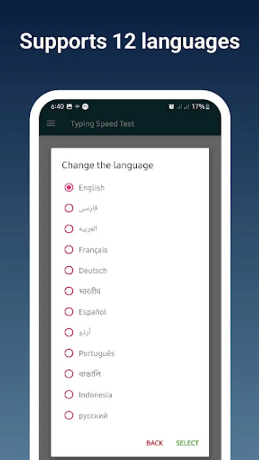 The application supports 12 languages (English, Arabic, Spanish, French, Hindi, Urdu, Persian, Indonesian, German, Russian, Bengali and Portuguese).