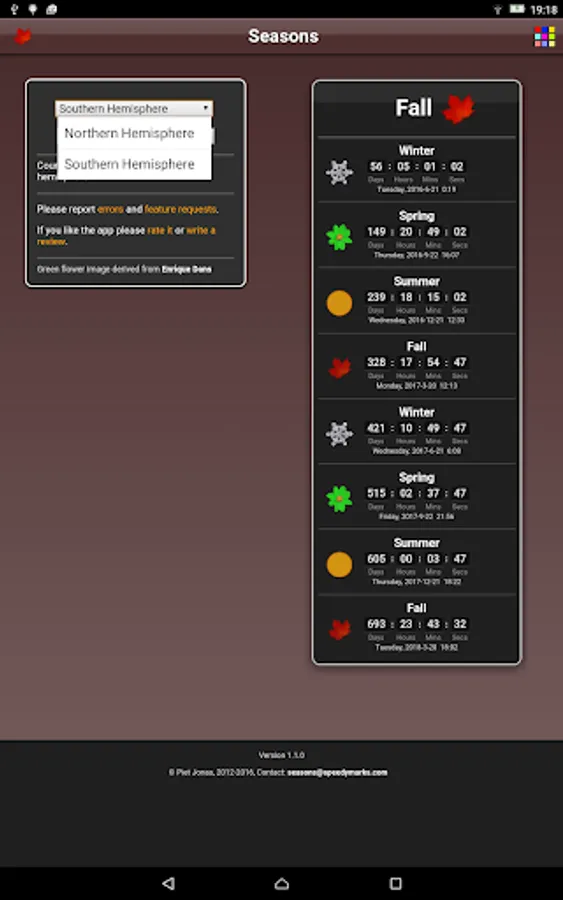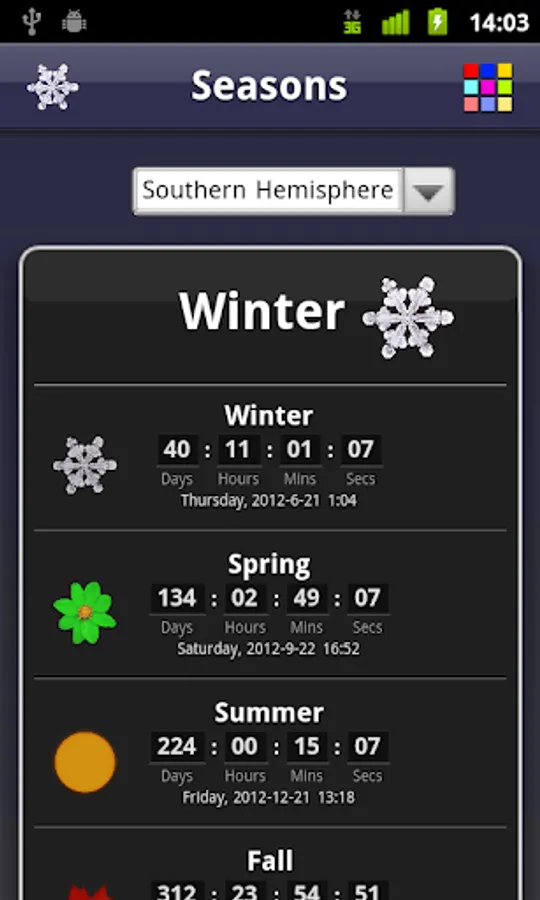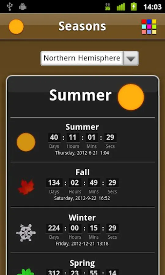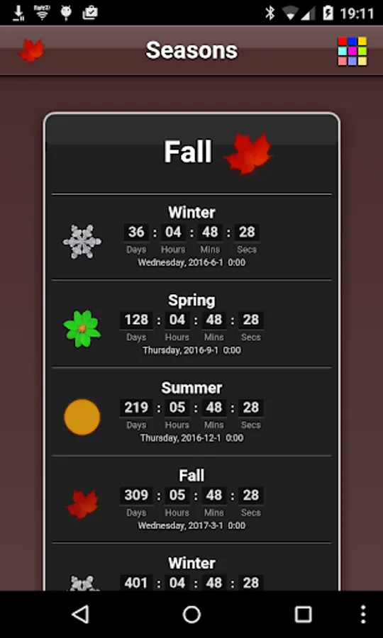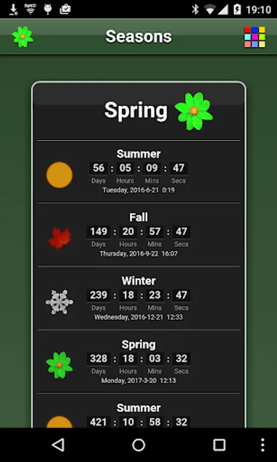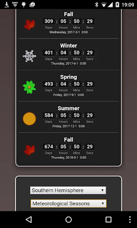 Countdown to the exact start time of the next seasons (spring, summer, fall/autumn and winter).