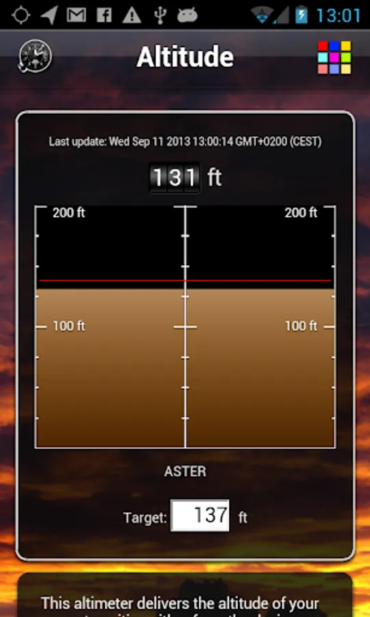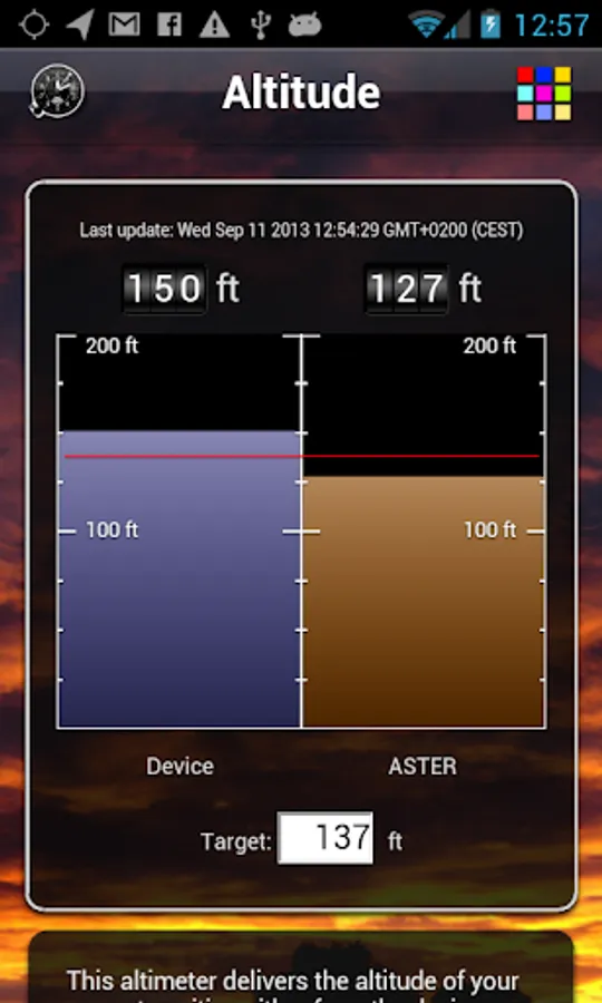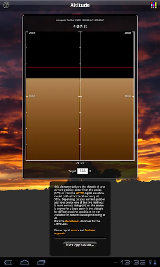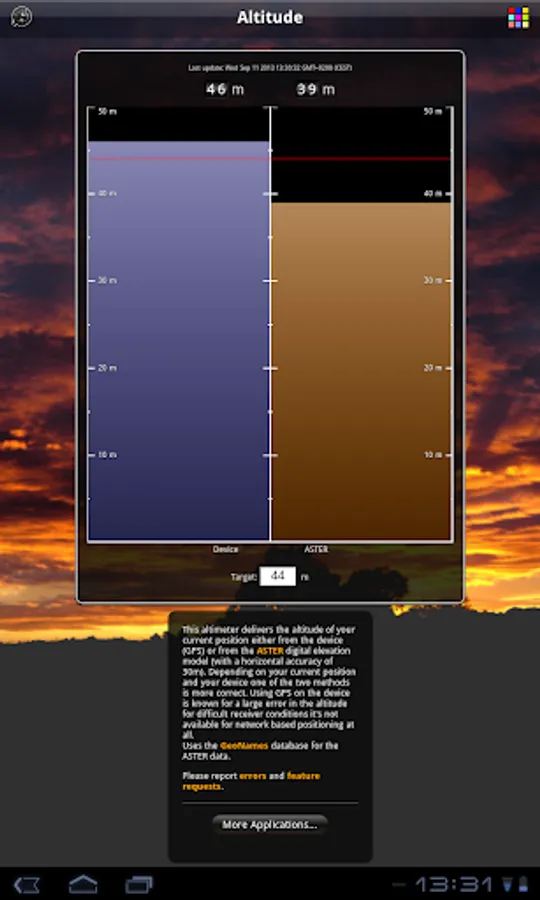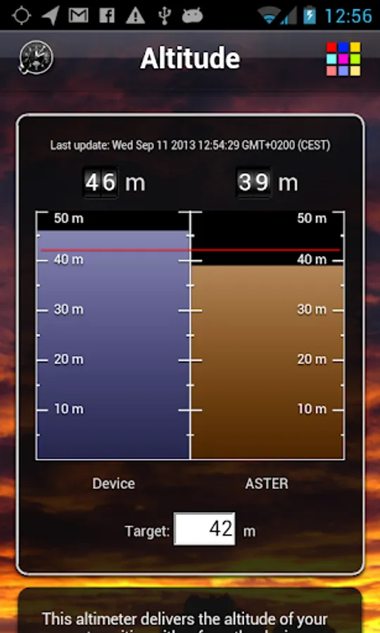 This altimeter delivers the altitude of your current position either from the device (GPS) or from the ASTER digital elevation model (with a horizontal accuracy of 30m).