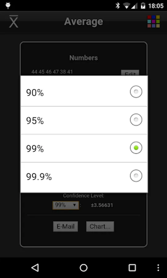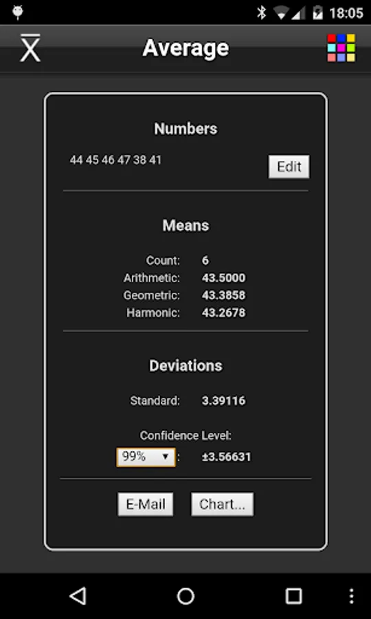 Calculates the arithmetic mean, the geometric mean and the harmonic mean as well as the standard deviation and the confidence interval of a set of numbers.