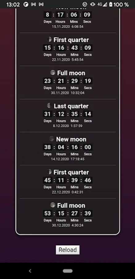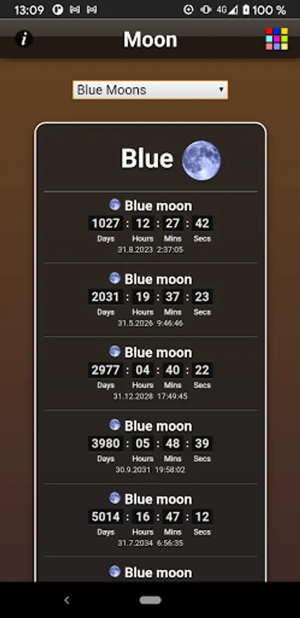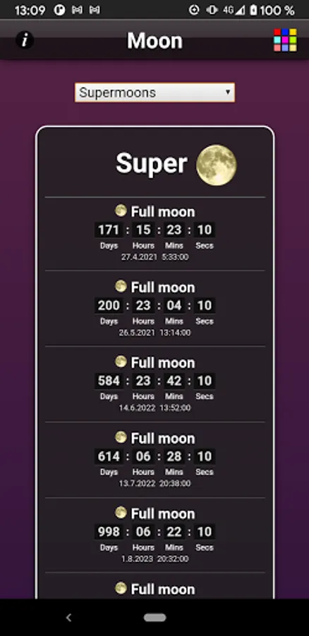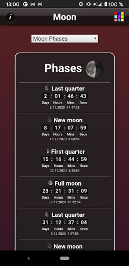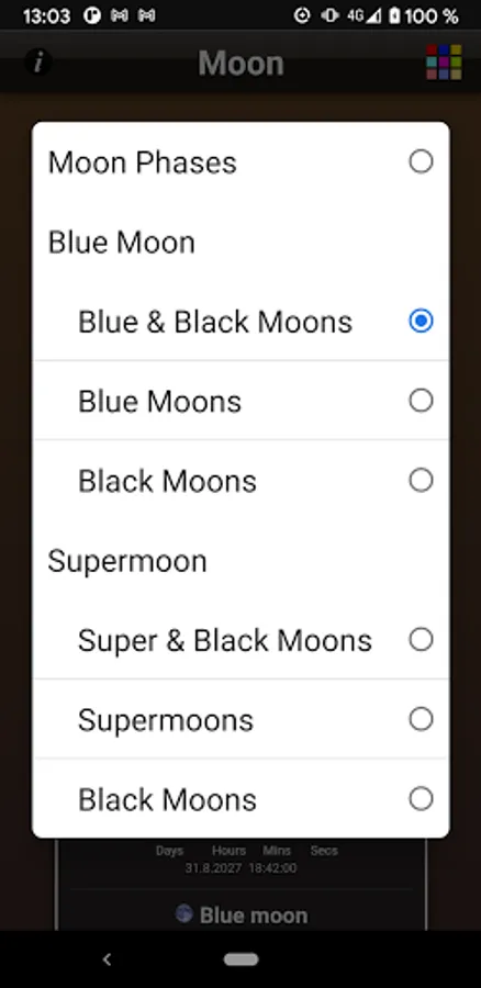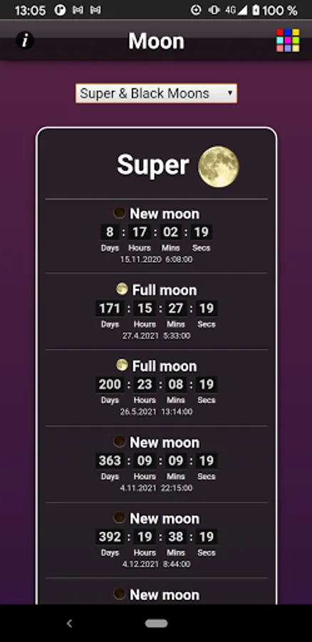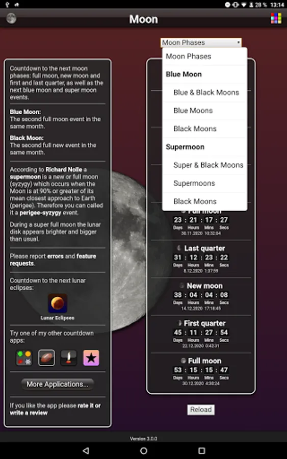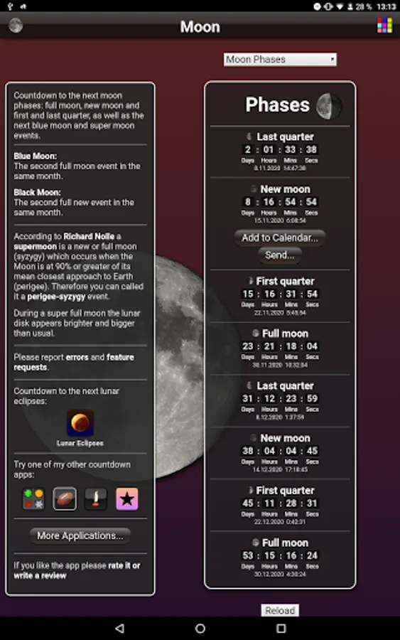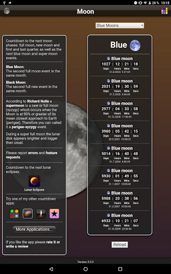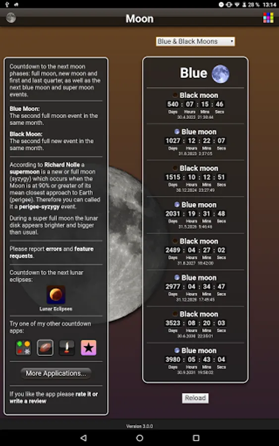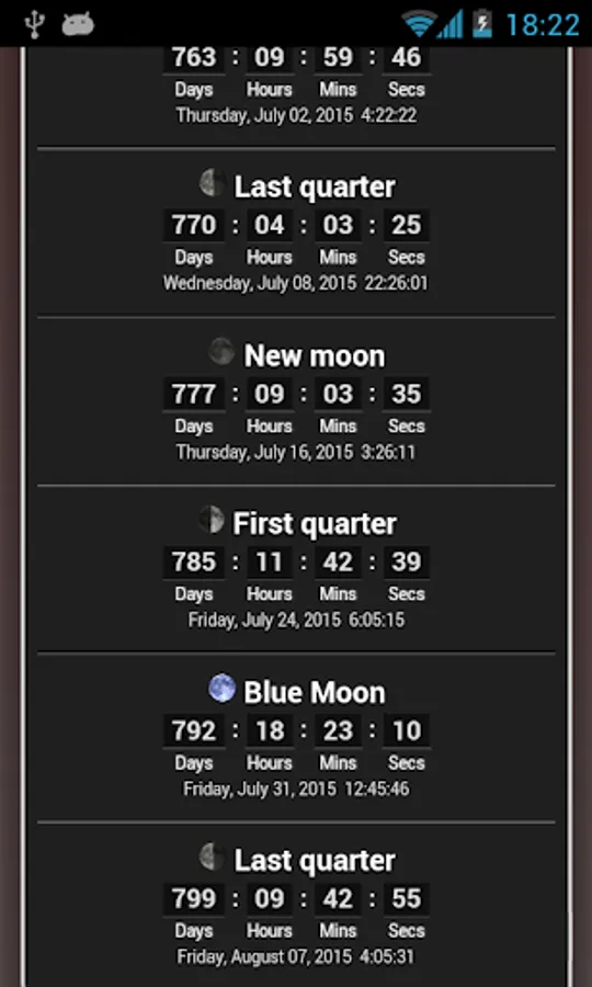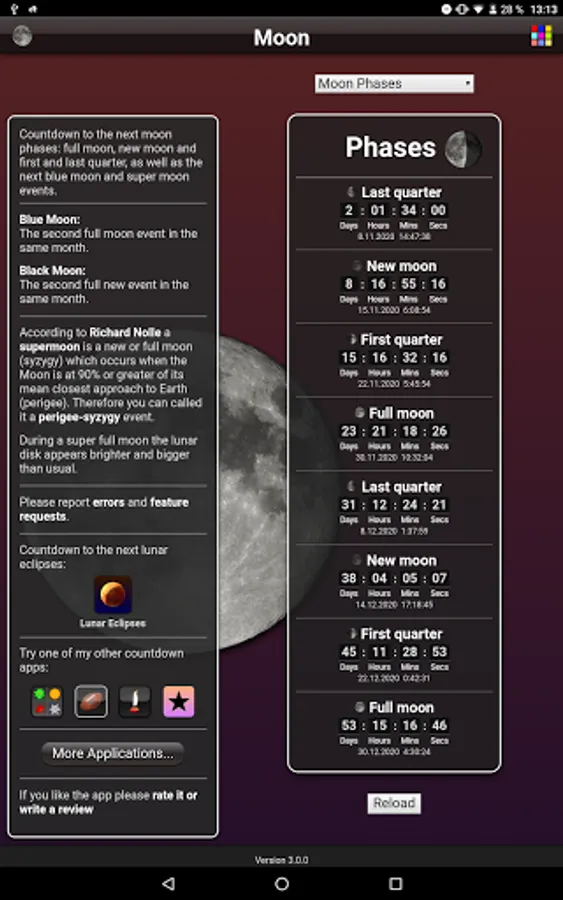 Countdown to the exact time of the next moon phases: full moon, new moon and first and last quarter, as well as the next blue moons and super moons