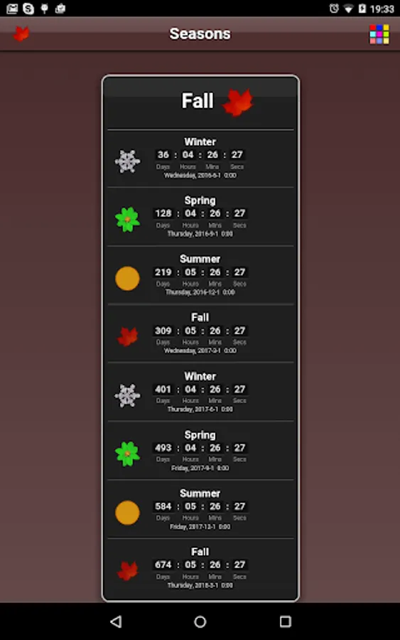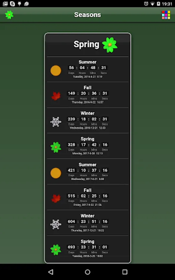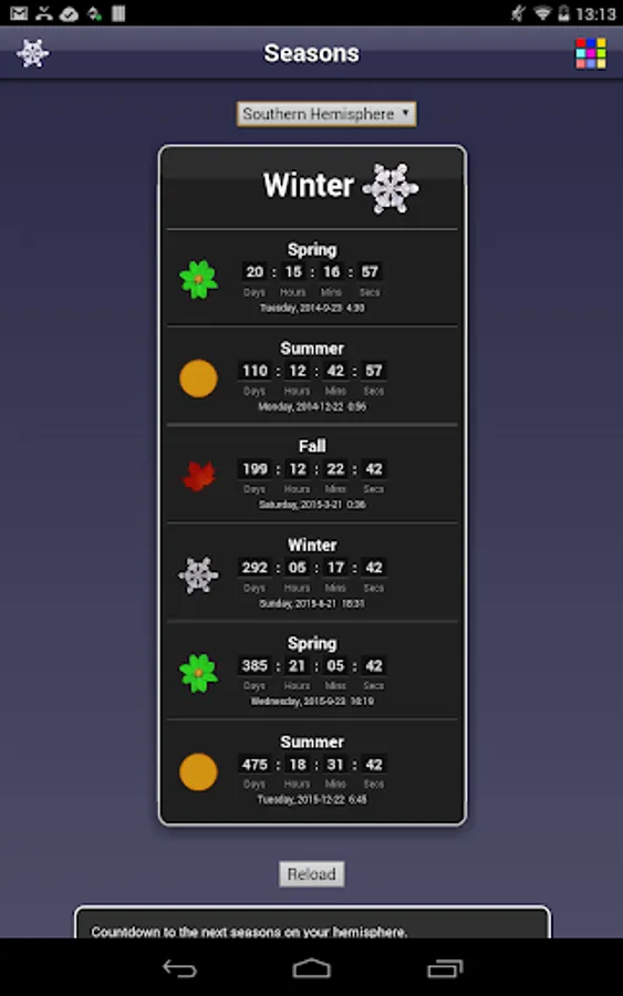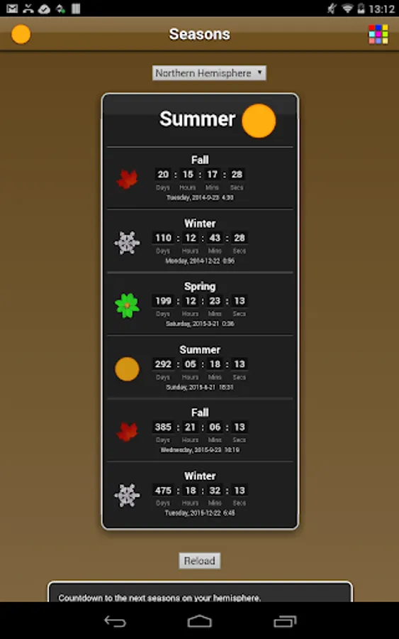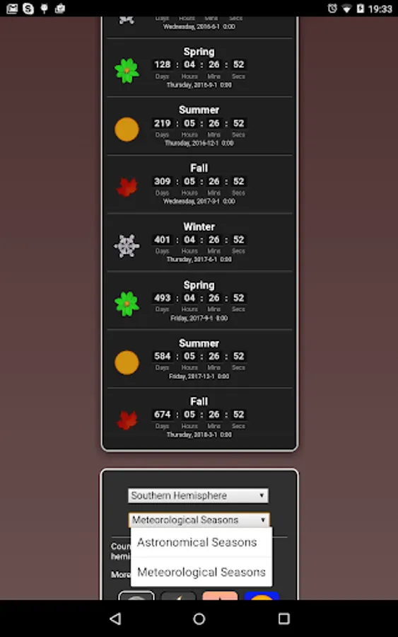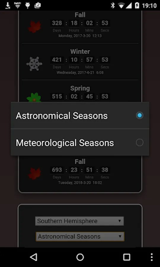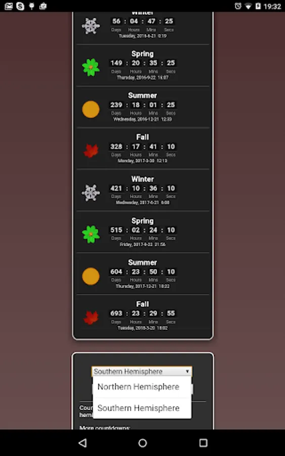 Countdown to the exact start time of the next seasons (spring, summer, fall/autumn, winter).