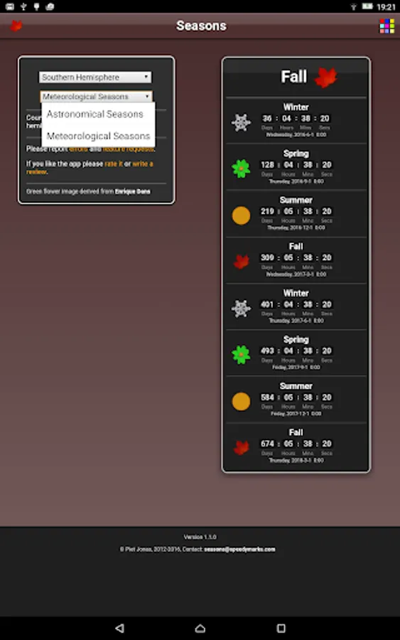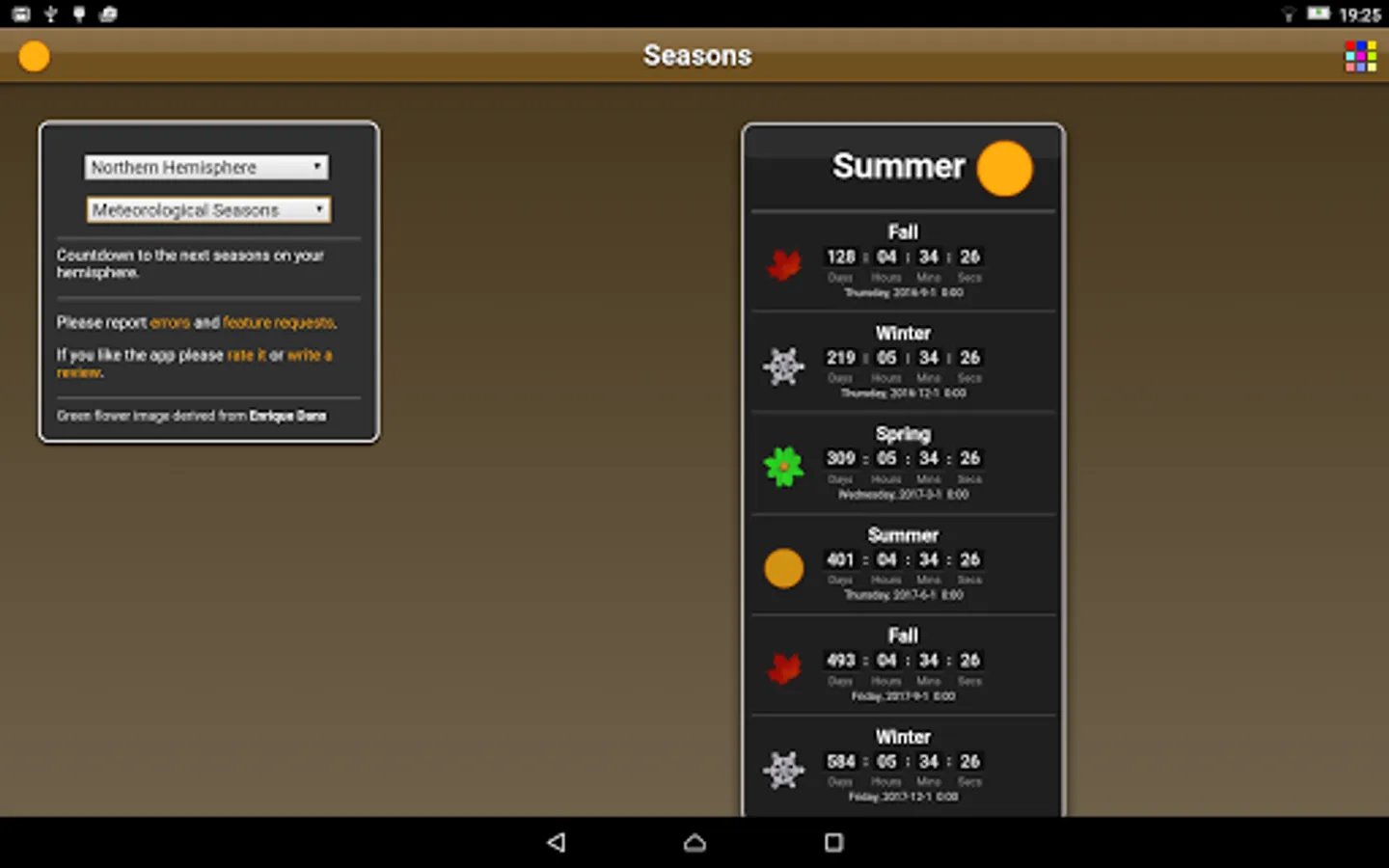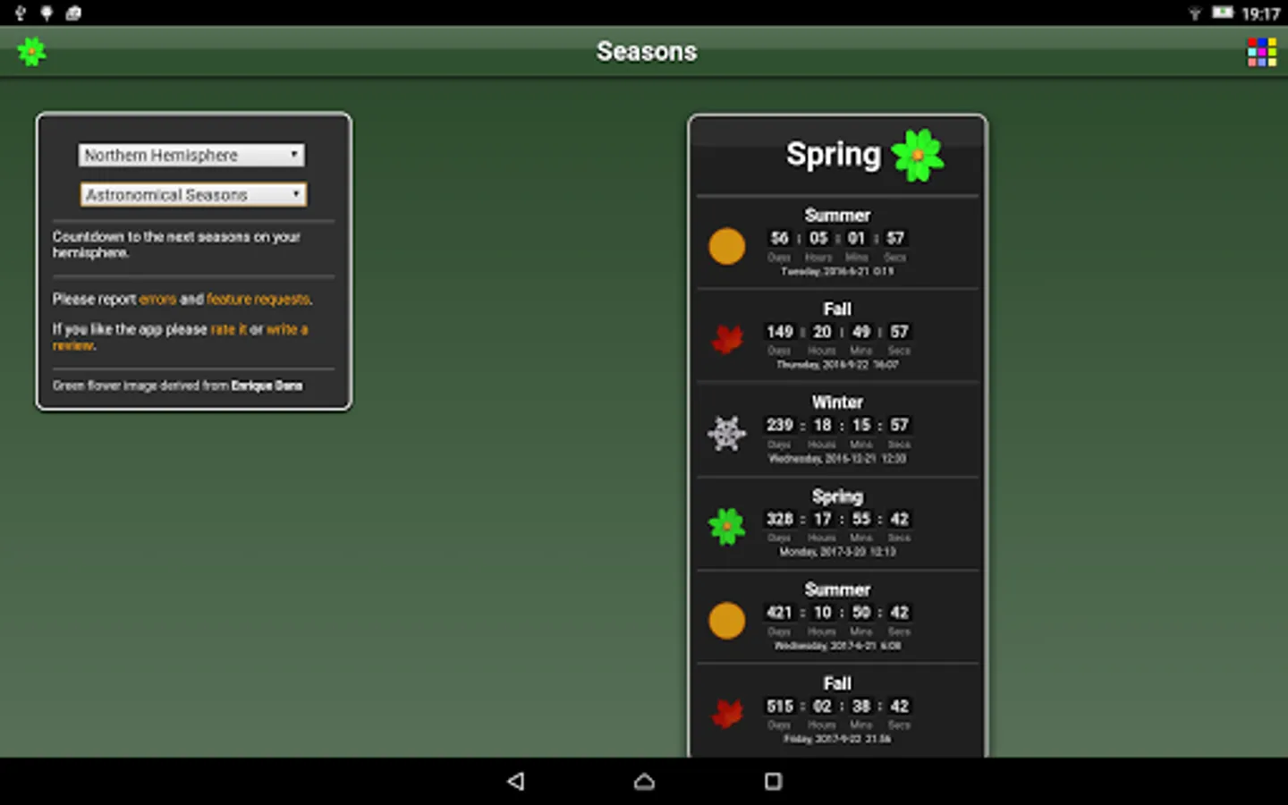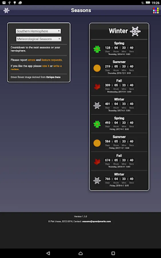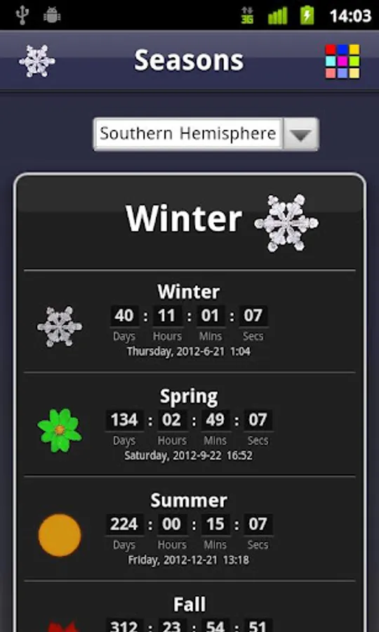 Countdown to the exact start time of the next seasons (spring, summer, fall/autumn, winter).