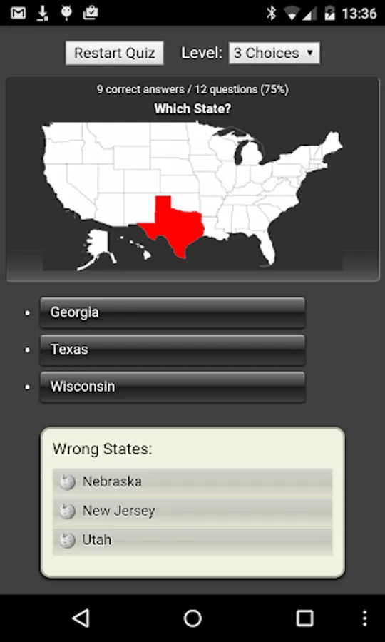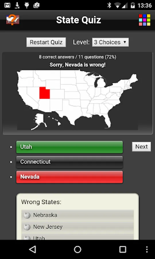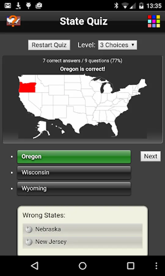 The wrongly guessed states are collected in a list with links to wikipedia for easy lookup.