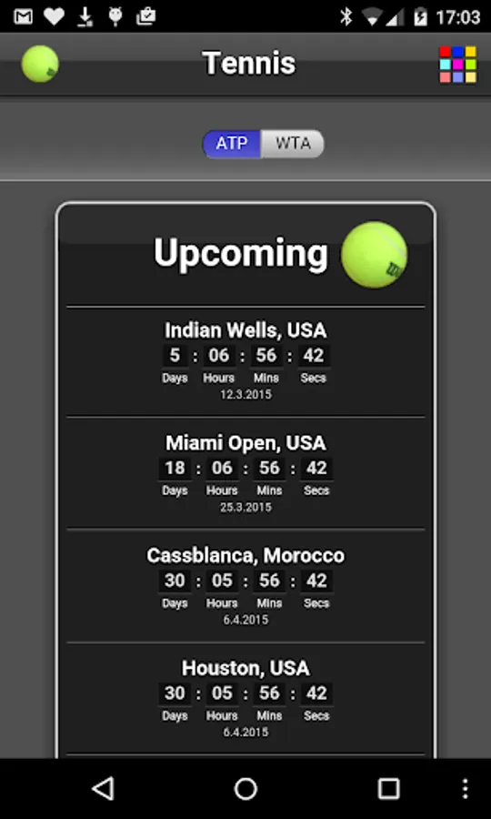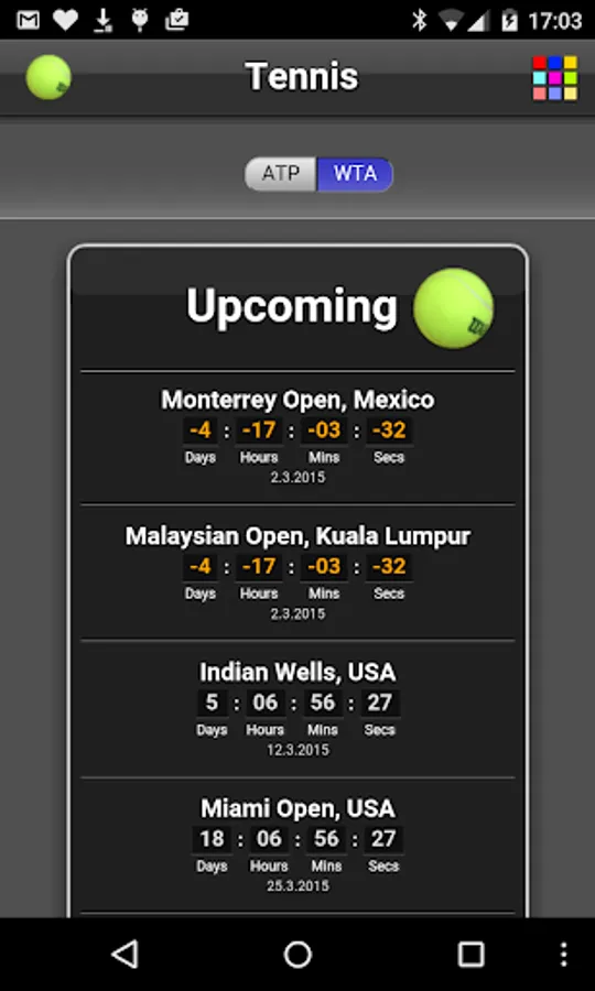 See the schedule and countdown to the upcoming ATP and WTA tennis tournaments (including grand slams). Shows the running tournaments as well.