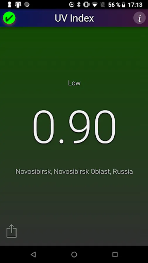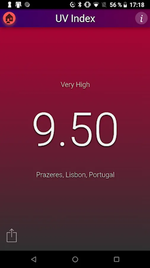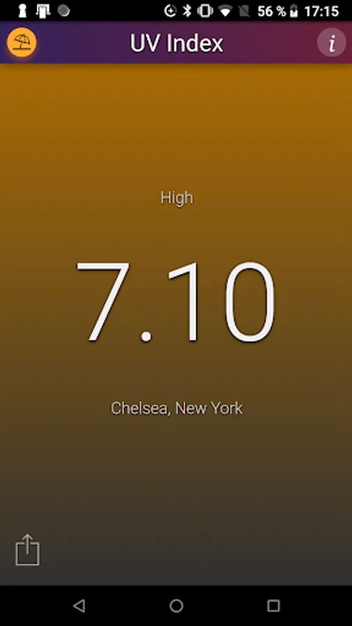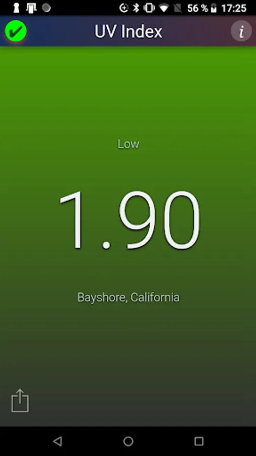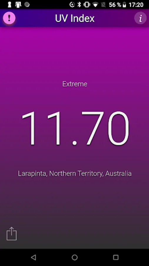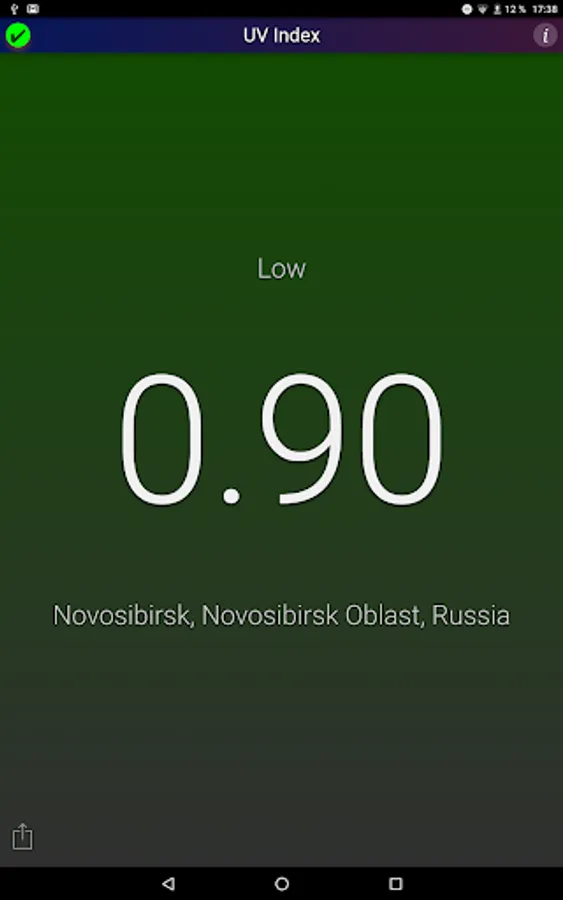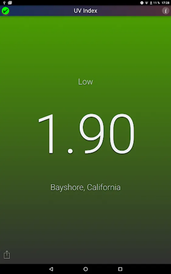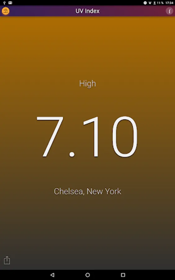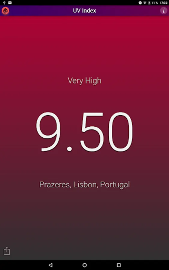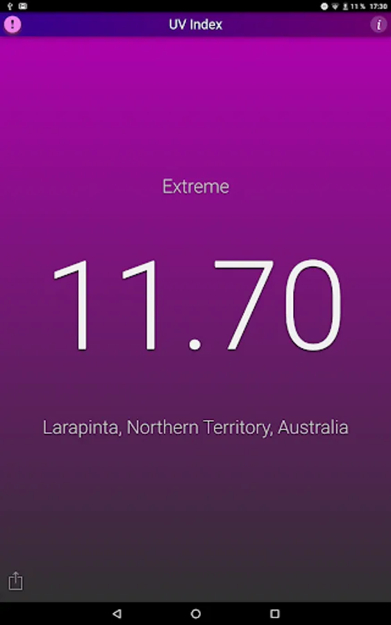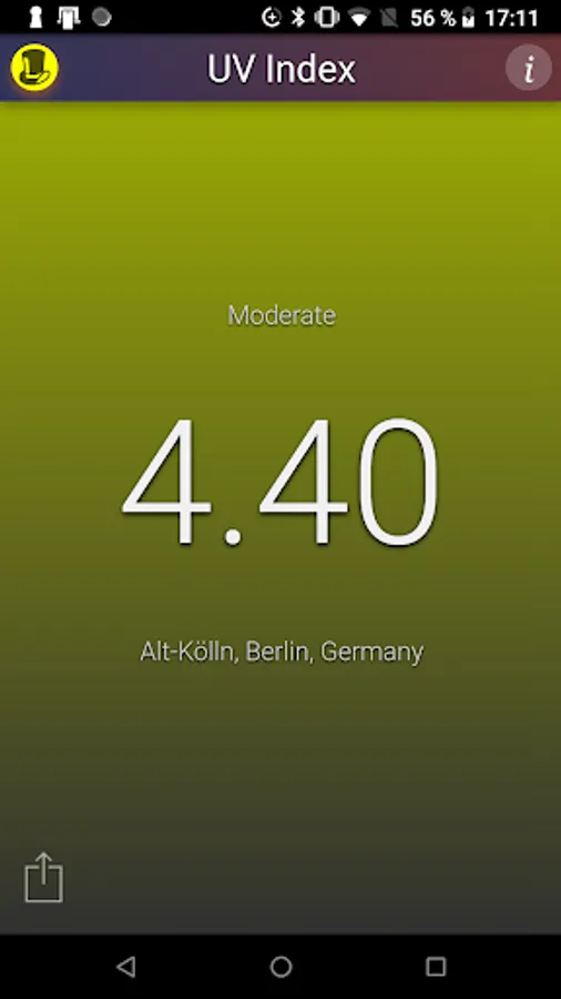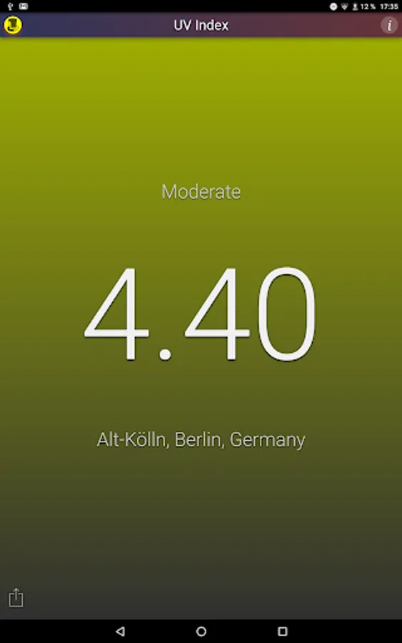 This application shows the local UV Index (strength of sun light) at noon for your current location. The background color changes with the UV Index.