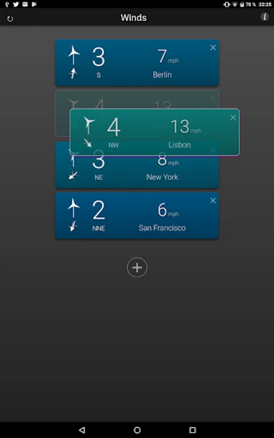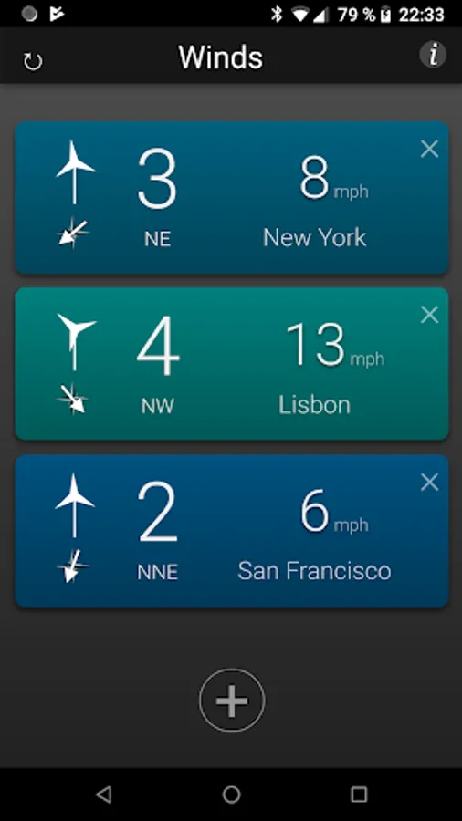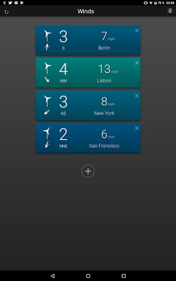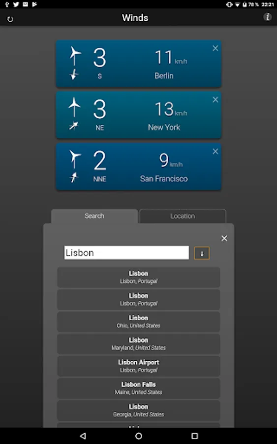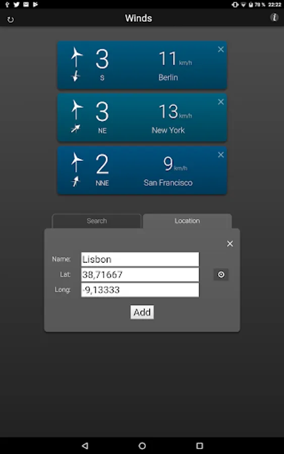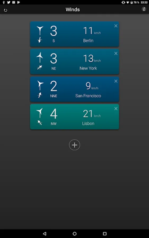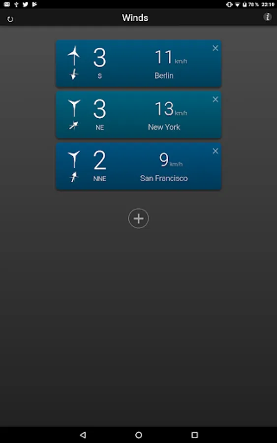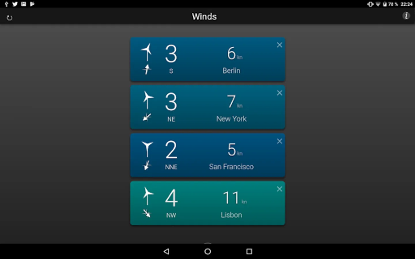 This application shows the current outdoor wind speed and direction for different locations, measured by a nearby weather station.