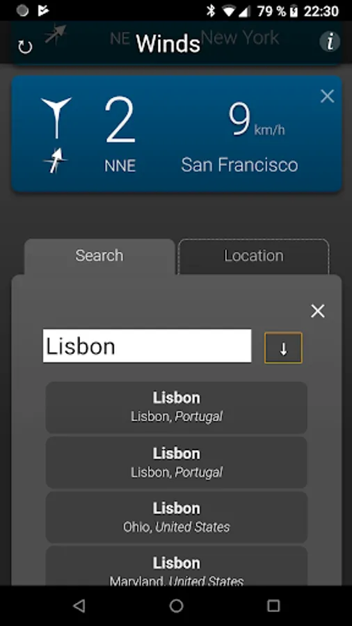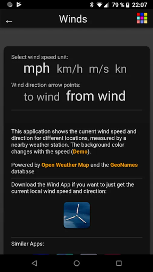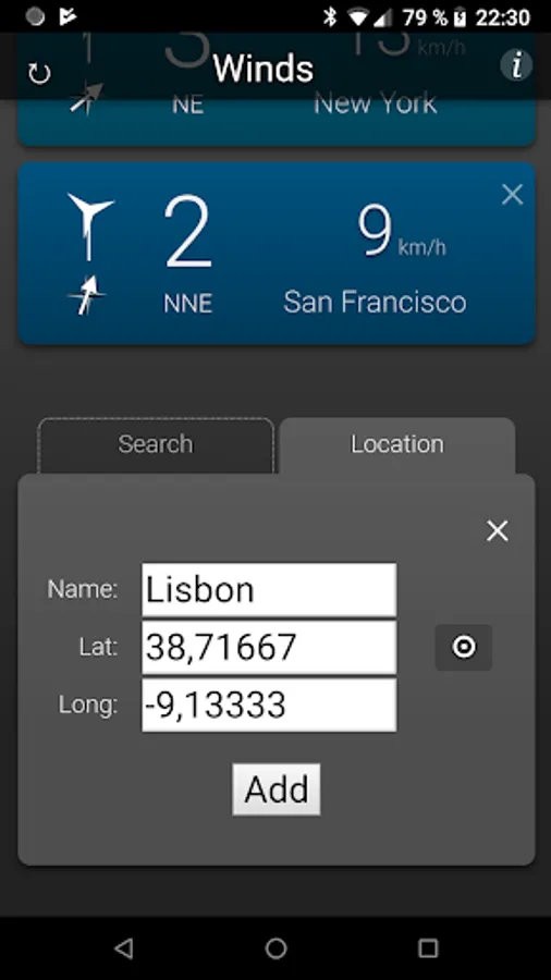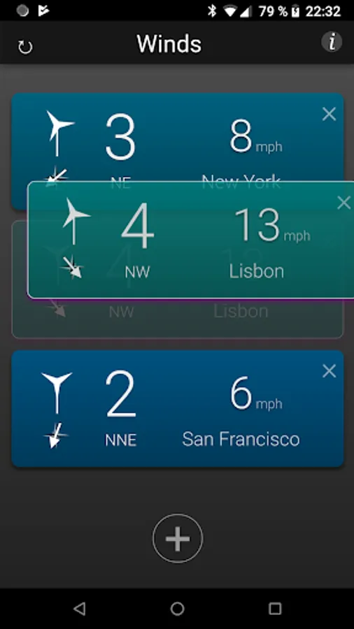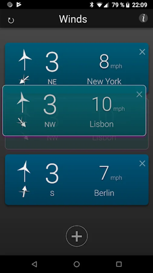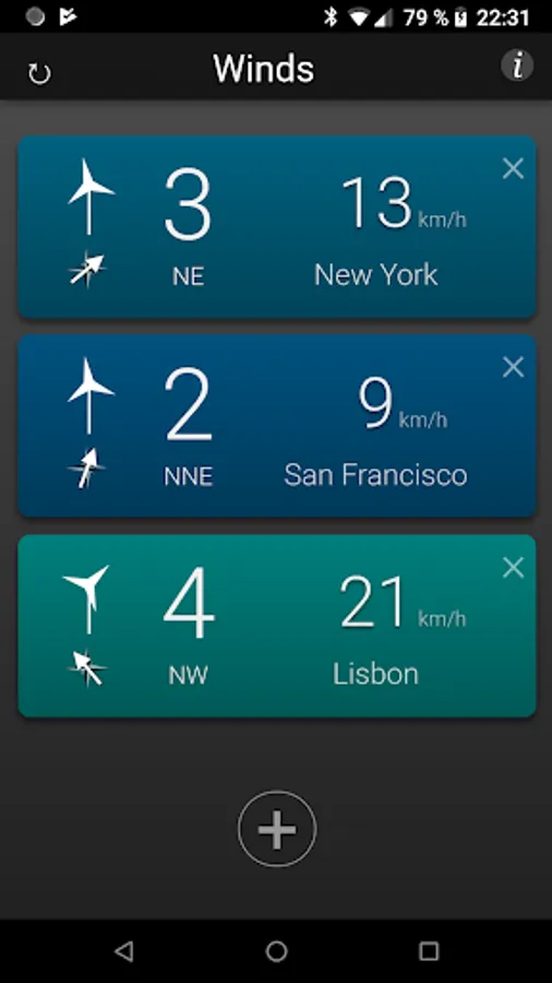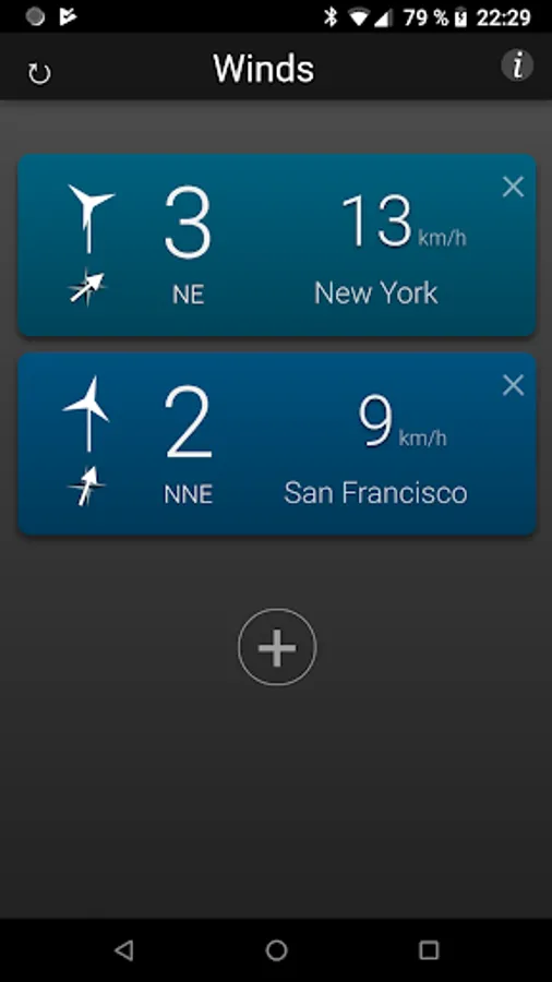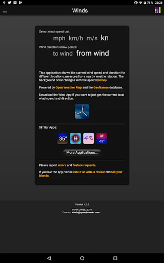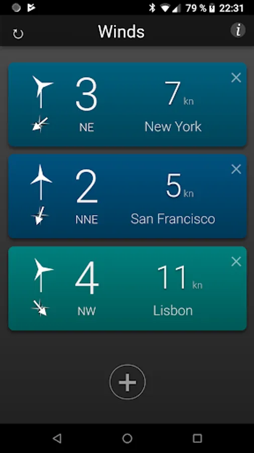 This application shows the current outdoor wind speed and direction for different locations, measured by a nearby weather station.