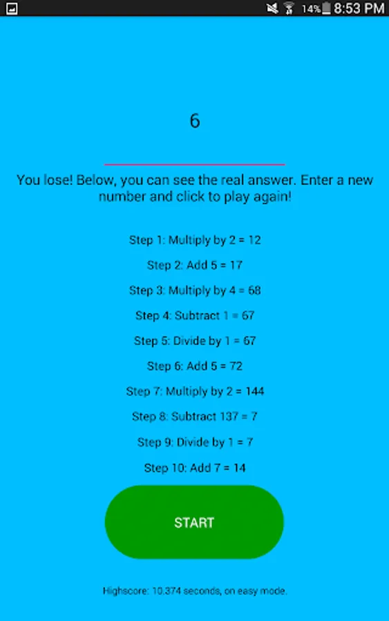 Do basic mathematical operations to a number of your choosing. You'll have to keep adding on to your initial number, and input the final number at the end. Can you keep up? NOTE: You must play on a device with a screen size of 4+ inches. 4-7 inches is best.