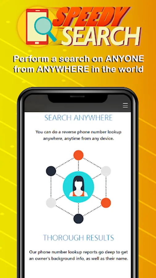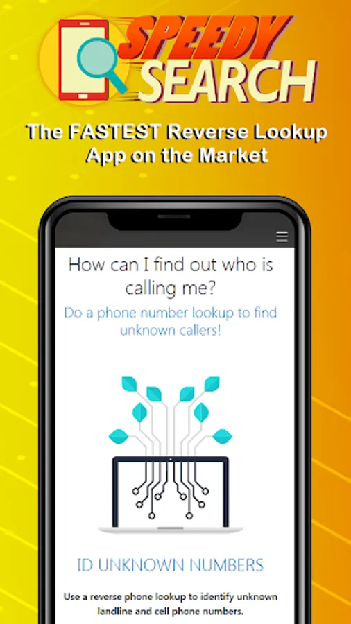 The SPEEDY SEARCH reverse phone number lookup app gives you all the info you need on an unknown caller. Run a phone search in just a few taps on our brand new people search app!