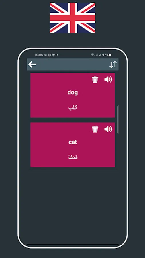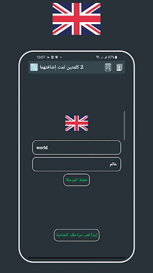 You write the English words that you want to memorize in the main interface with their translation, then you press the play button and you can start a fun game that helps you memorize the words of the English language, where the word appears in English in a red box and then you have to write its translation in the input box, if you answer A correct answer moves to the next word, but if you make a mistake twice, the skip stage button will appear for you. By pressing the button, the translation of the word into Arabic will appear for you to memorize it again, and then you will move to the next English word, and so on until you learn English words.