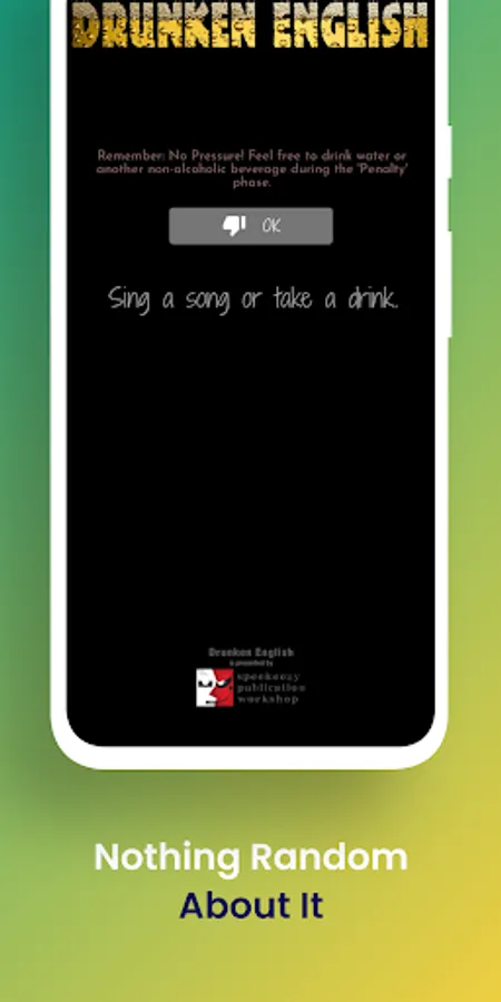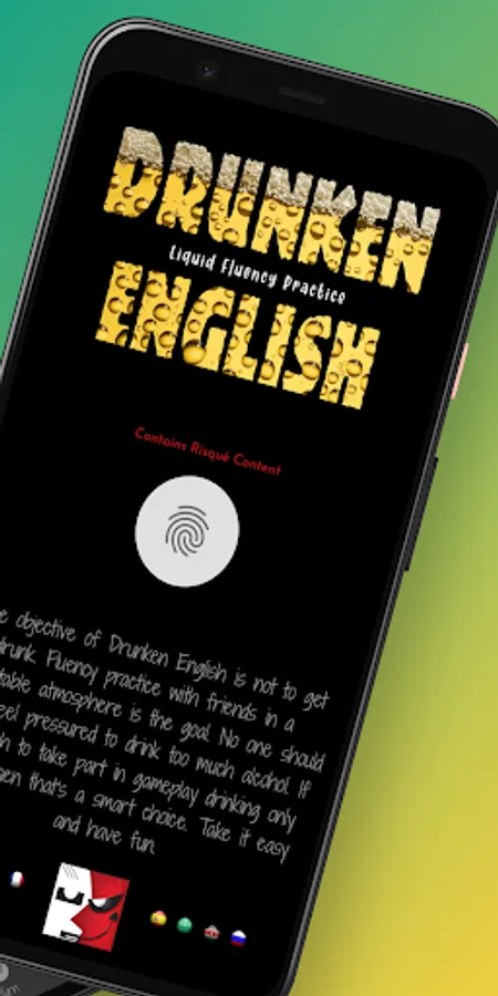 One unshakable rule of Drunken English is that participants should never be coerced into drinking alcohol. That condition is stated plainly throughout the app with high profile positioning and translated into 8 key languages on the initial landing screen.