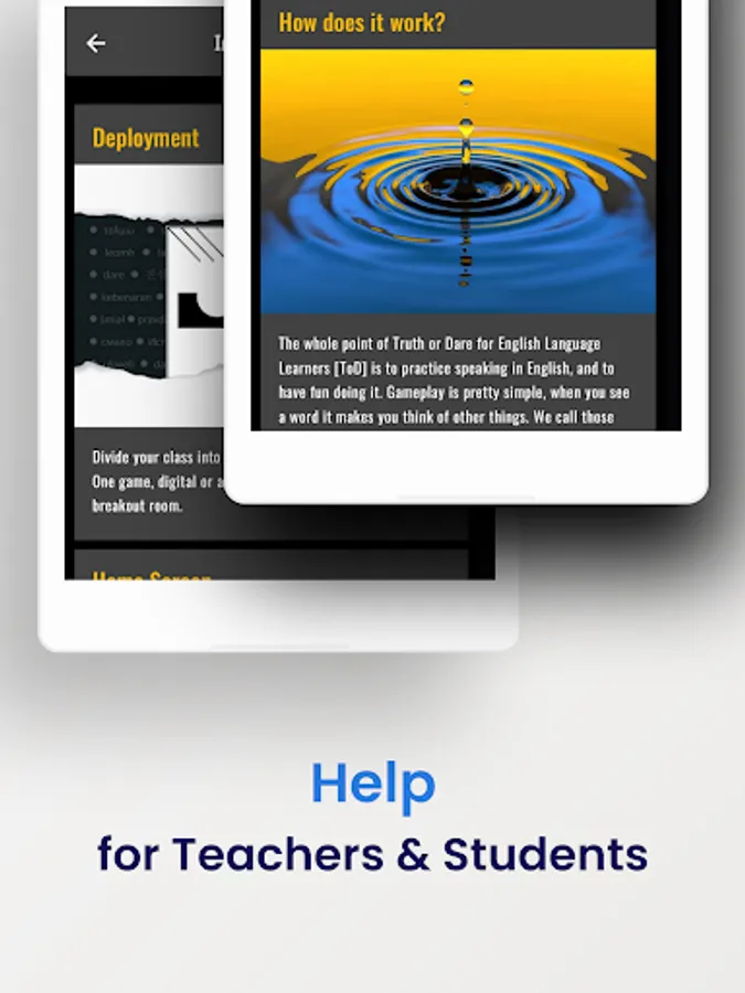 Conversation-based learning at its best, Truth or Dare for English Language Learners [ToD] is more than just a game: it’s a chance for students to communicate about real things in a controlled, pressure-free environment. For their part, students might just see it as a whole lot of fun. Used judiciously, however, Truth or Dare can be a useful tool for incorporating meaningful practice into the routine of learning. Use it also to gauge progress with spoken output and assess which learning targets have been attained. Truth or Dare is easy to deploy in the classroom. Whether looking to just reward students, liven up class time or set, test and meet serious goals, Truth or Dare for English Language Learners should be part of every teacher’s bag of tricks.