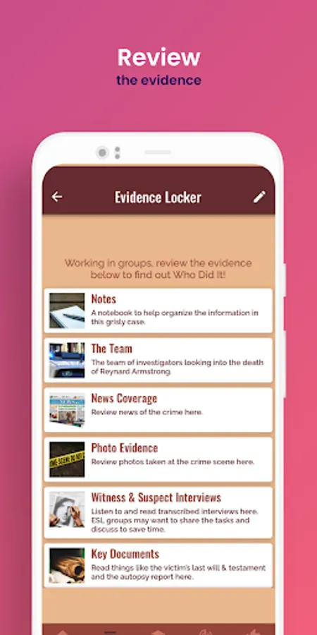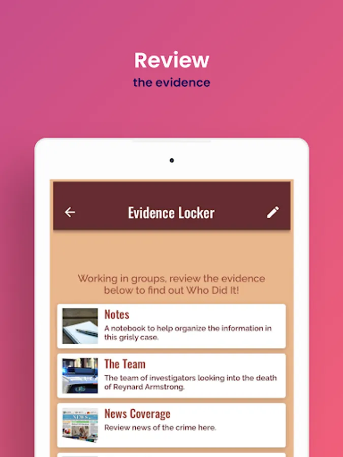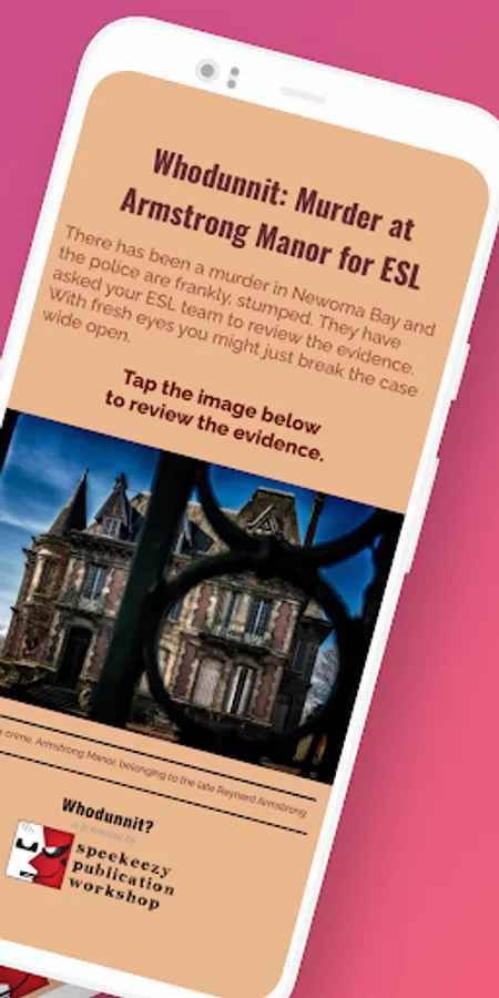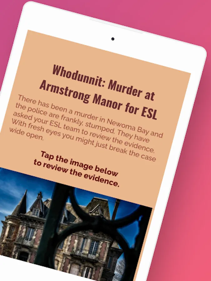 Get your students into groups to solve the mystery of Murder at Armstrong Manor. This Whodunnit has all the advantages of project-based learning PBL, fostering problem solving, critical thinking, collaboration, enhanced communication skills while engaging the kinds of learners that are often left behind in the traditional classroom. Through a PBL approach, students are empowered to find their own paths through the chaos of evidence using English to explore, assess and ultimately arrive at a synthesis.