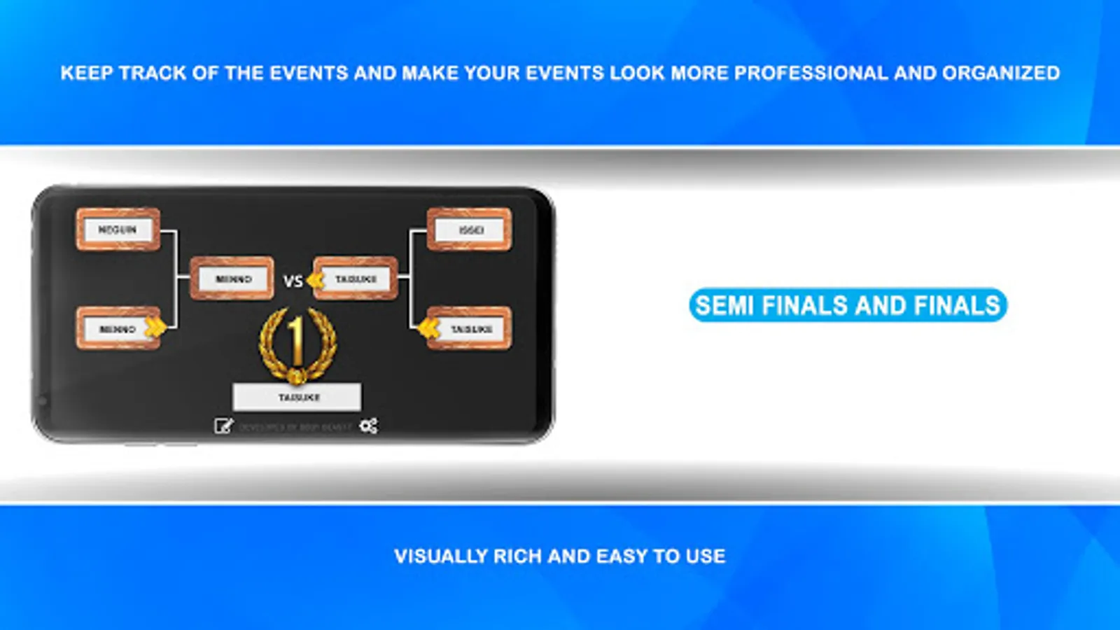 Make your events look more professional and organized by creating visually rich and stunning knockout bracket styled charts within no time using Knockout Pro . Our aim is to provide the users with a very simple to use yet powerful app to create, customize and keep track of all their events, tournaments, fun family games on the go without worrying about spending hours on layers and layers of designing. A one of a kind Bracket app.