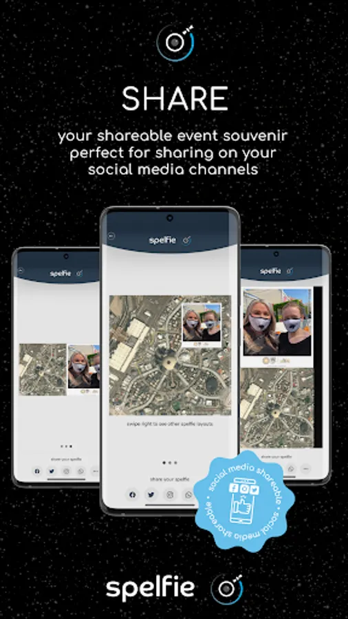 Your unique event moment is captured forever with your selfie from space. Create a legacy and capture memories like never before. In the selfie app you can relive all your spelfies again and again!