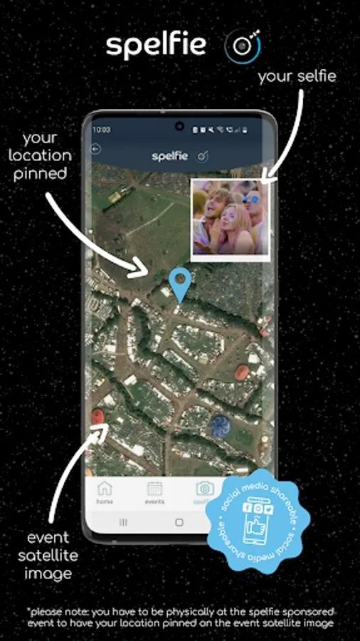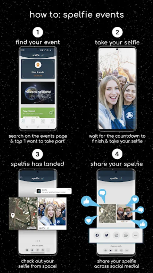 spelfie is the first selfie app of its kind, using satellites to capture major events and all attendees…from space (yes…space)! Capture your own space selfie to share and create memories with friends and family, it’s completely out of this world…